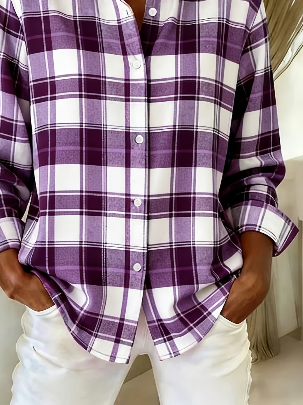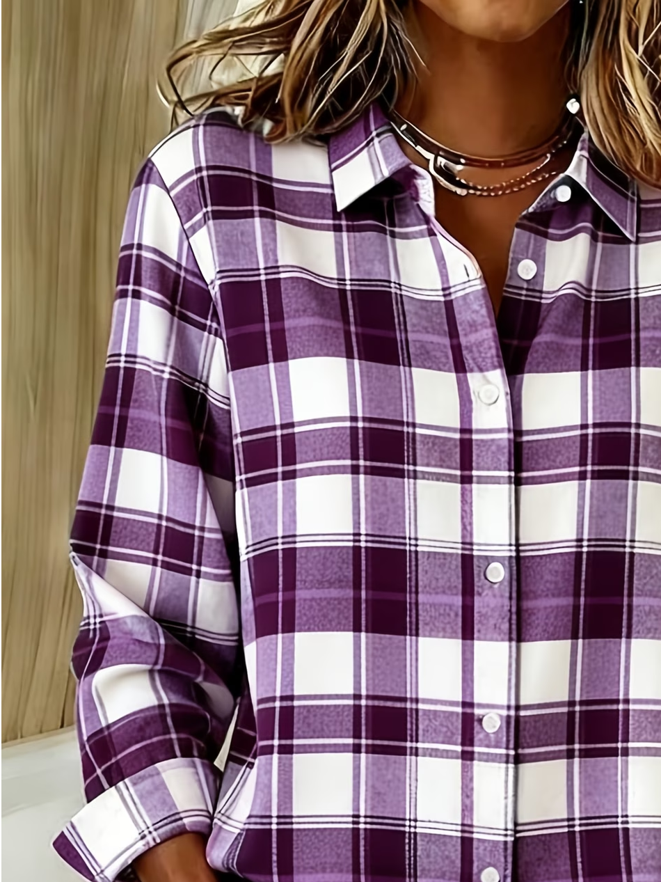 Women's Long Sleeve Shirt Spring/Fall Purple Plaid Buckle Shirt Collar Regular Sleeve Daily Going Out Casual Top