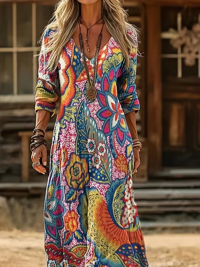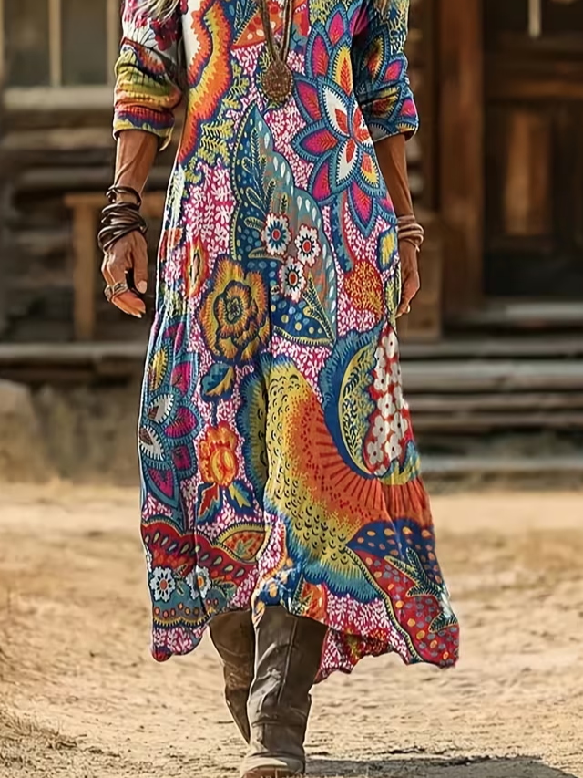 Women's Long Sleeve Spring/Fall As Picture Floral Printing V Neck Daily Going Out Vintage Maxi H-Line Dress