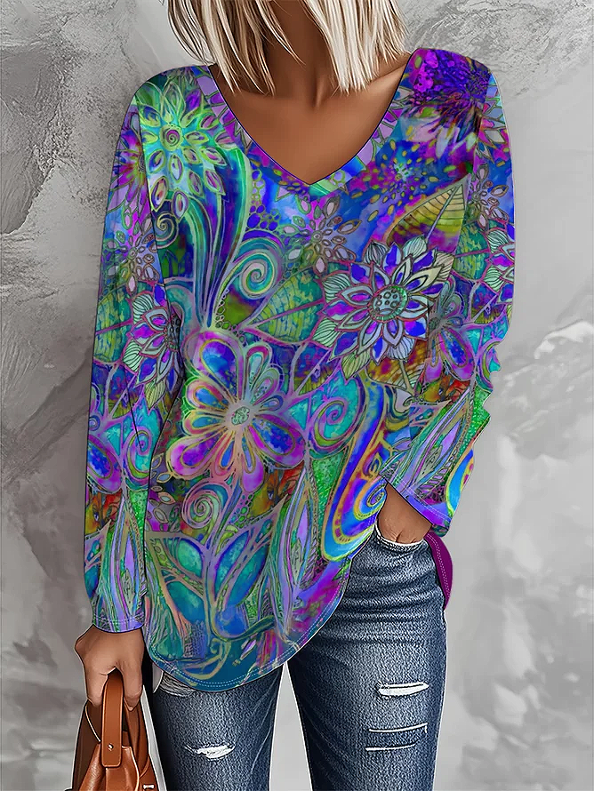 Women's Long Sleeve T-shirt Spring/Fall Purple Abstract Printing Jersey V Neck Daily Going Out Casual Top