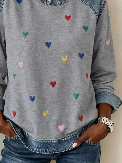 Women's Love Print Print Patchwork Denim Crewneck Long-Sleeved Sweatshirt