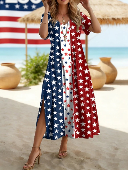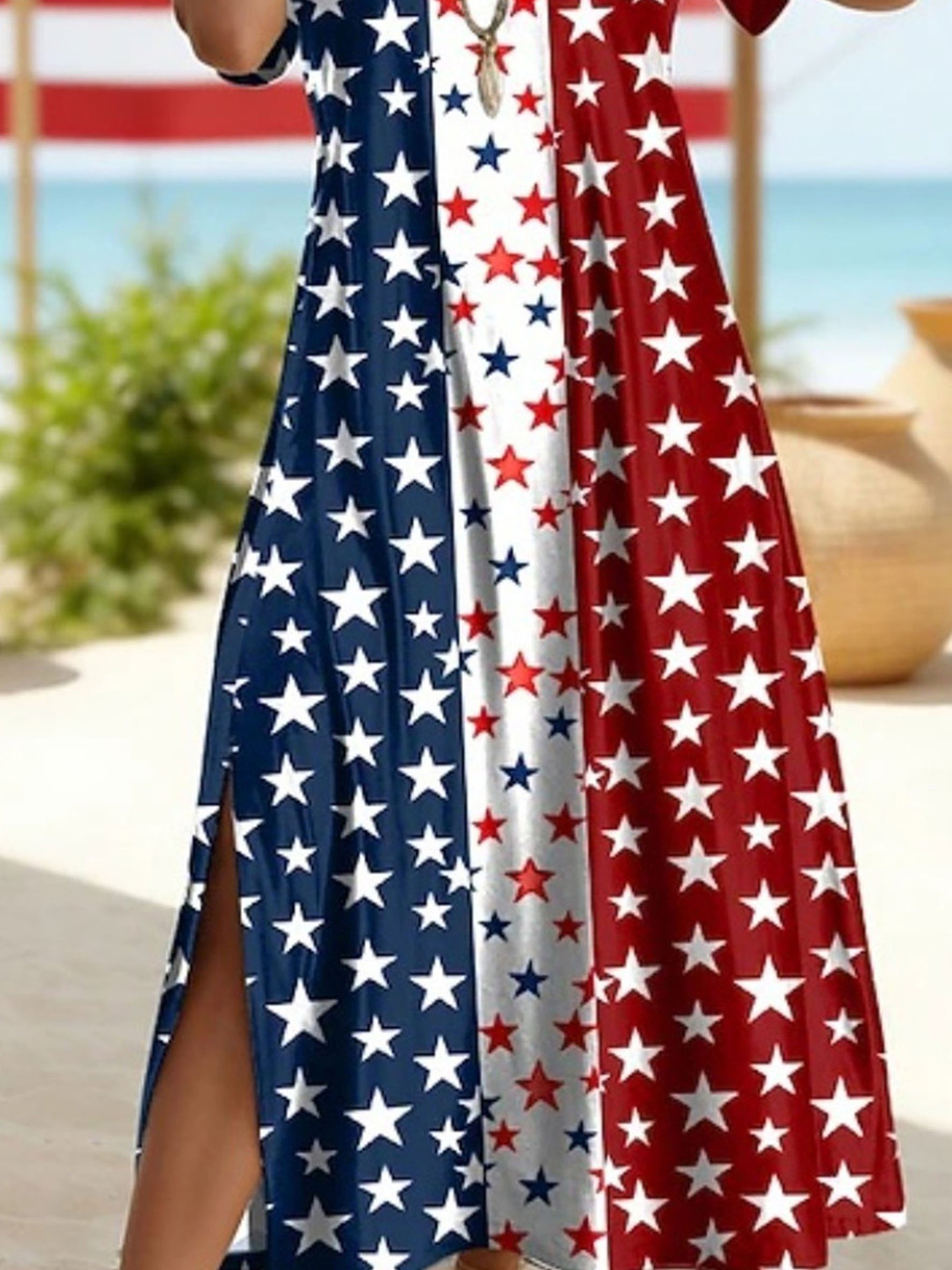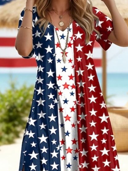 Women's Short Sleeve Summer As Picture Color Block Star Printed Independence Day V Neck Short Sleeve Daily Going Out Casual Maxi A-Line T-Shirt Dress 250th Anniversary