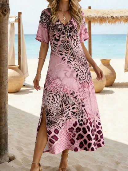 Women's Short Sleeve Summer As Picture Leopard Printed V Neck Short Sleeve Daily Going Out Casual Maxi A-Line T-Shirt Dress