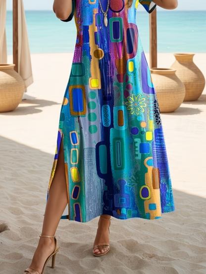 Women's Short Sleeve Summer Blue Abstract Printing Crew Neck Daily Going Out Casual Maxi H-Line T-Shirt Dress Dress