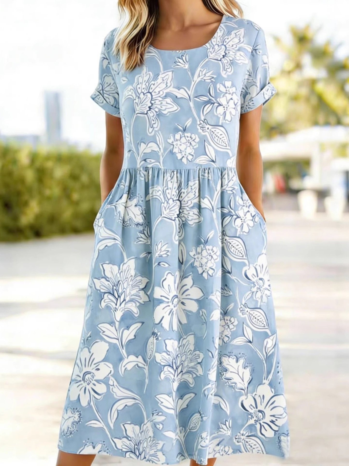 Women's Short Sleeve Summer Blue Floral Printing Round Neck Daily Going Out Casual Maxi A-Line Dress