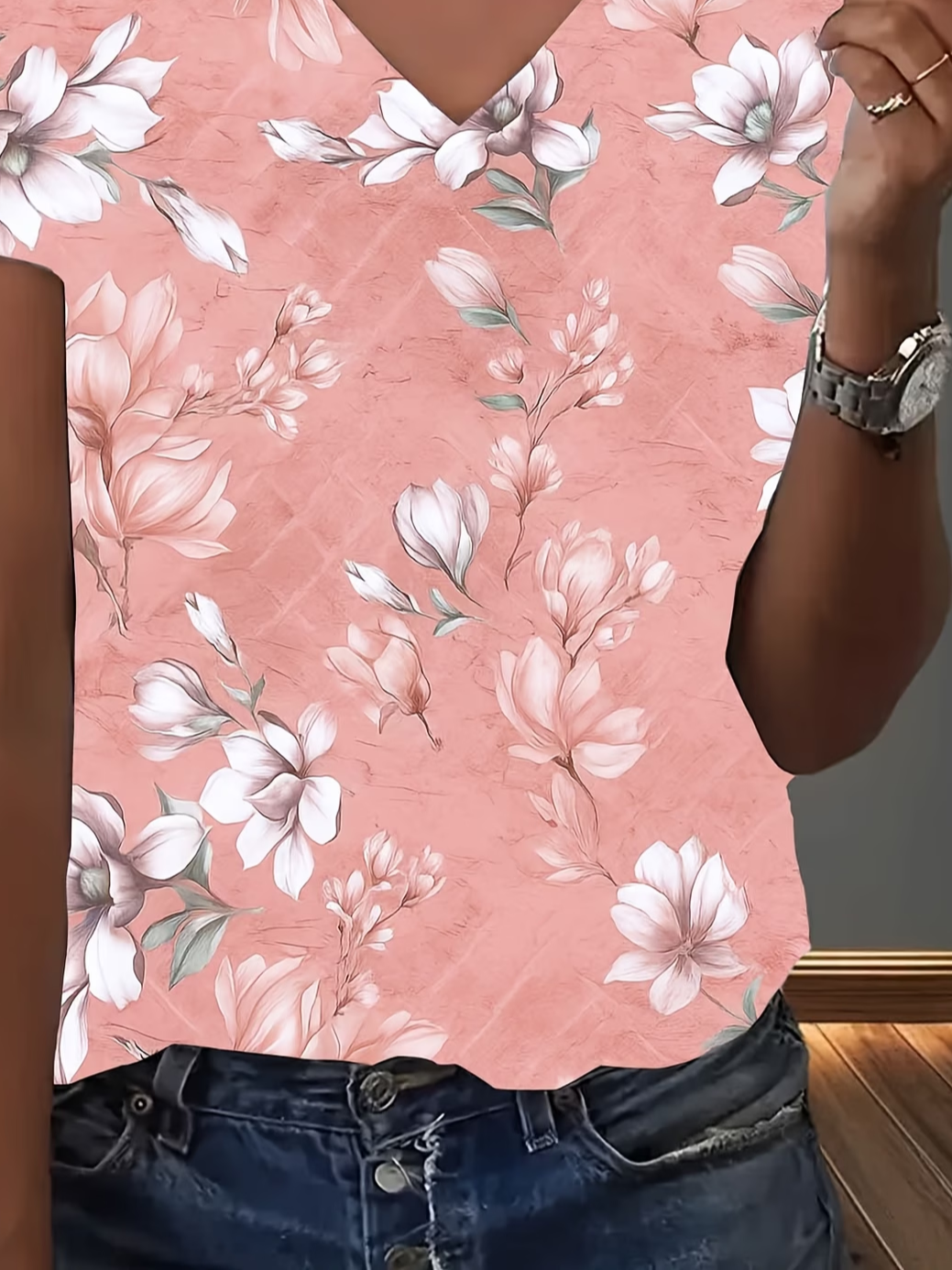 Women's Short Sleeve T-shirt Summer Pink Floral Printing V Neck Holiday Going Out Vintage Top