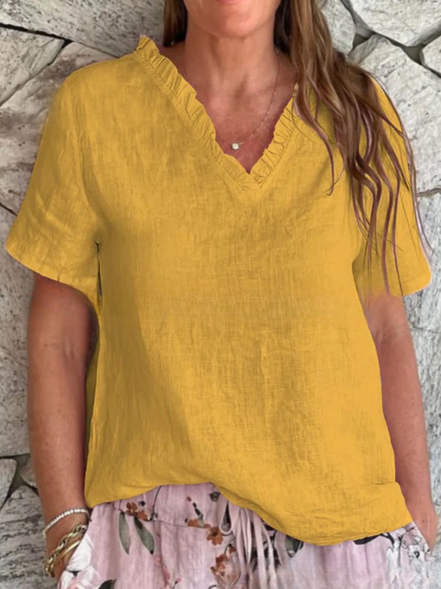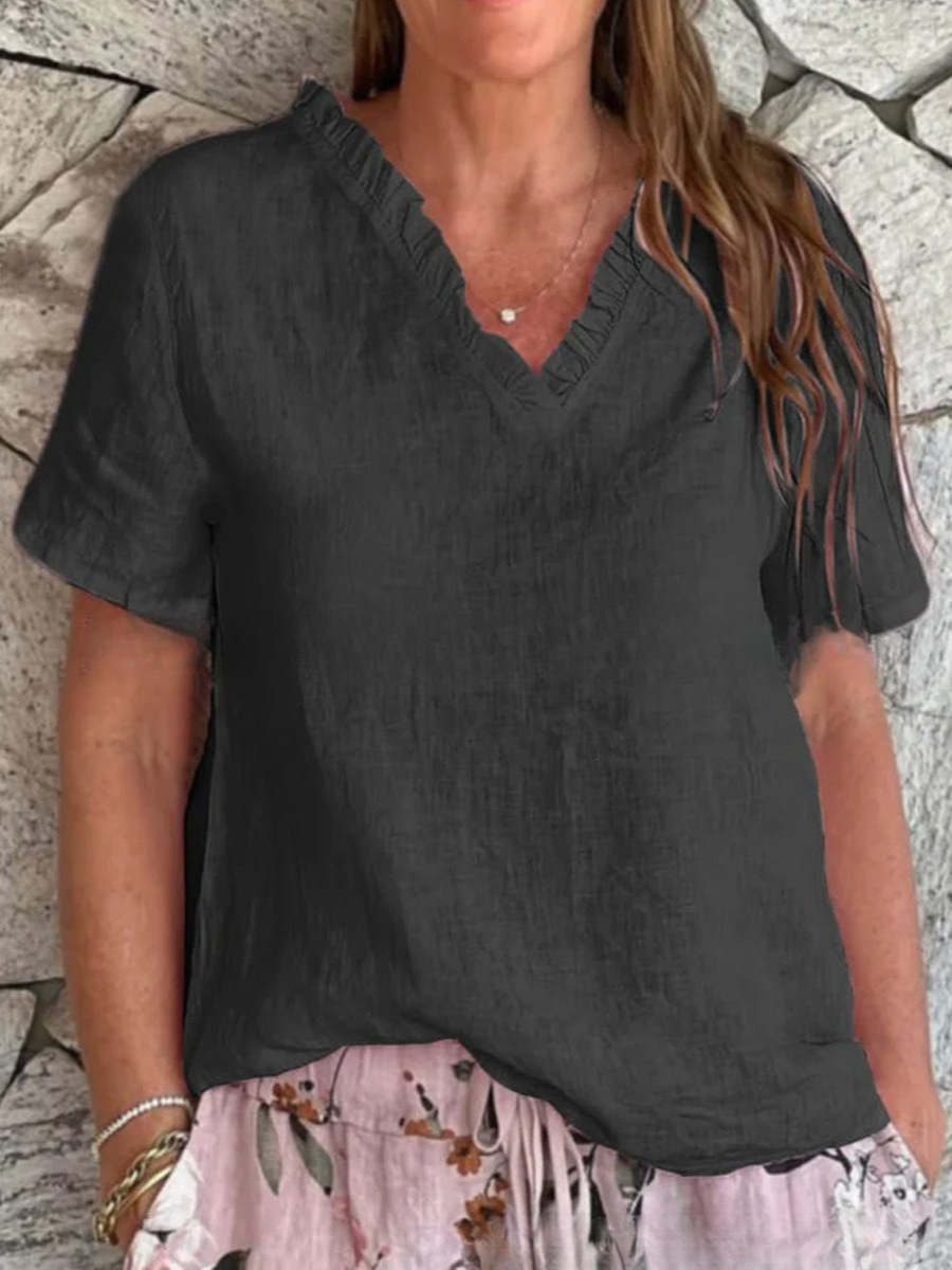 Women's Short Sleeve T-shirt Summer White Plain Split Joint Cotton And Linen V Neck Daily Going Out Casual Top