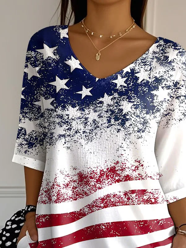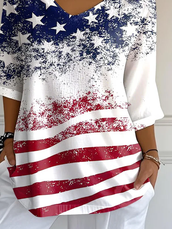 Women's Three Quarter Sleeve T-shirt Spring/Fall White America Flag Printing V Neck Daily Going Out Casual Top