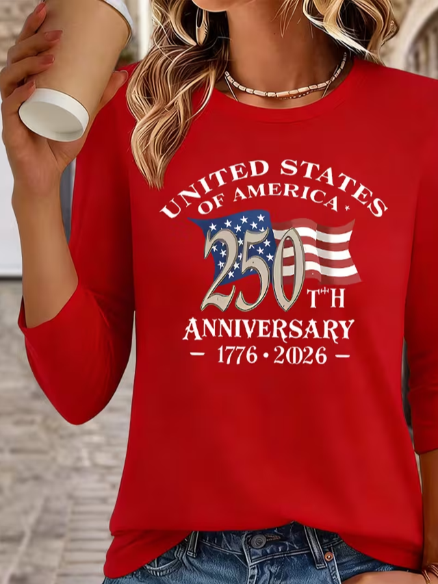 Women's USA 250th Anniversary Long Sleeve T-shirt Spring/Fall Red America Flag Printing Jersey Crew Neck Daily Going Out Casual Top