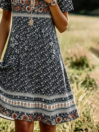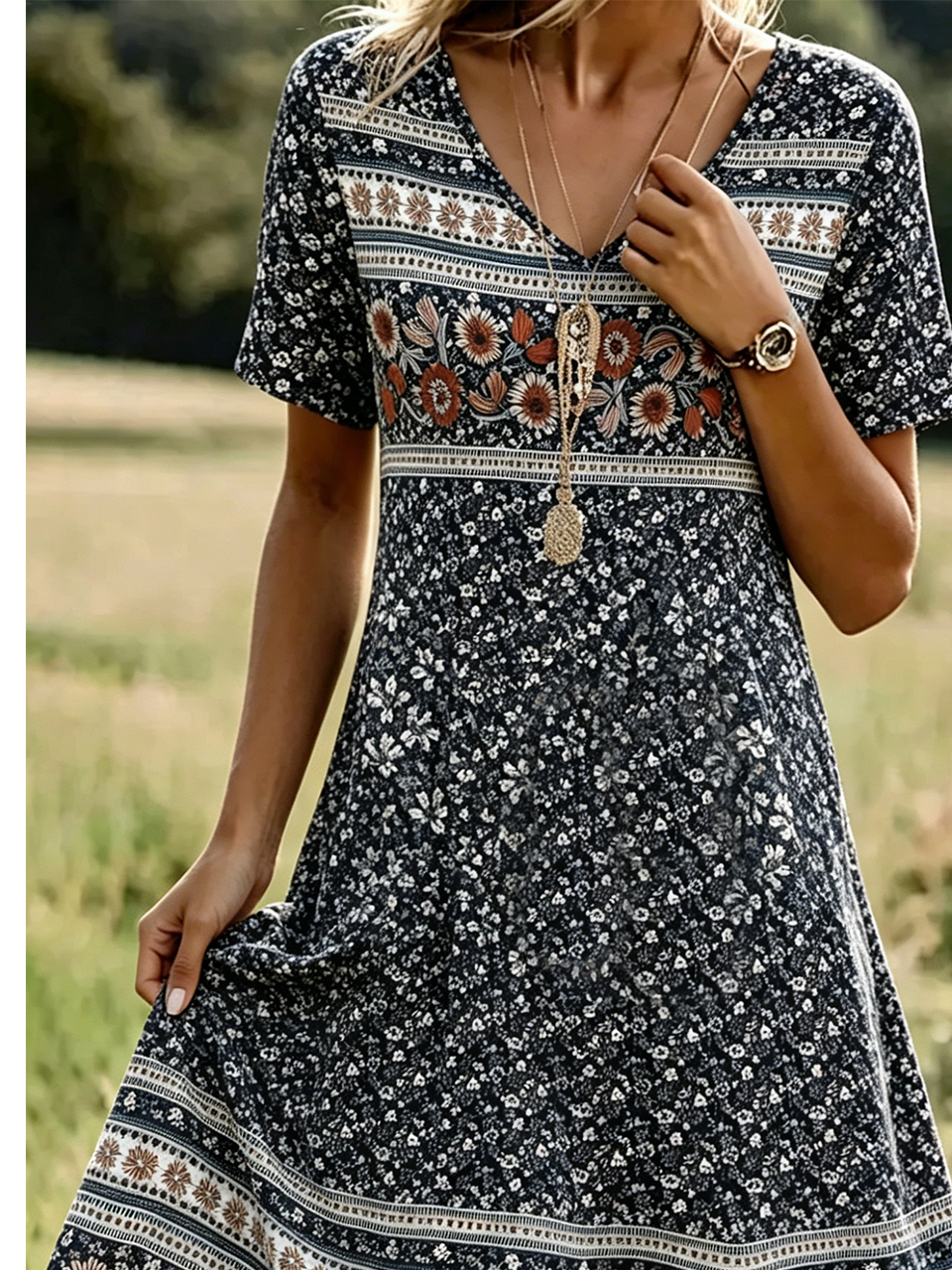 Women's Vintage Floral V-Neck Short-Sleeve Dress