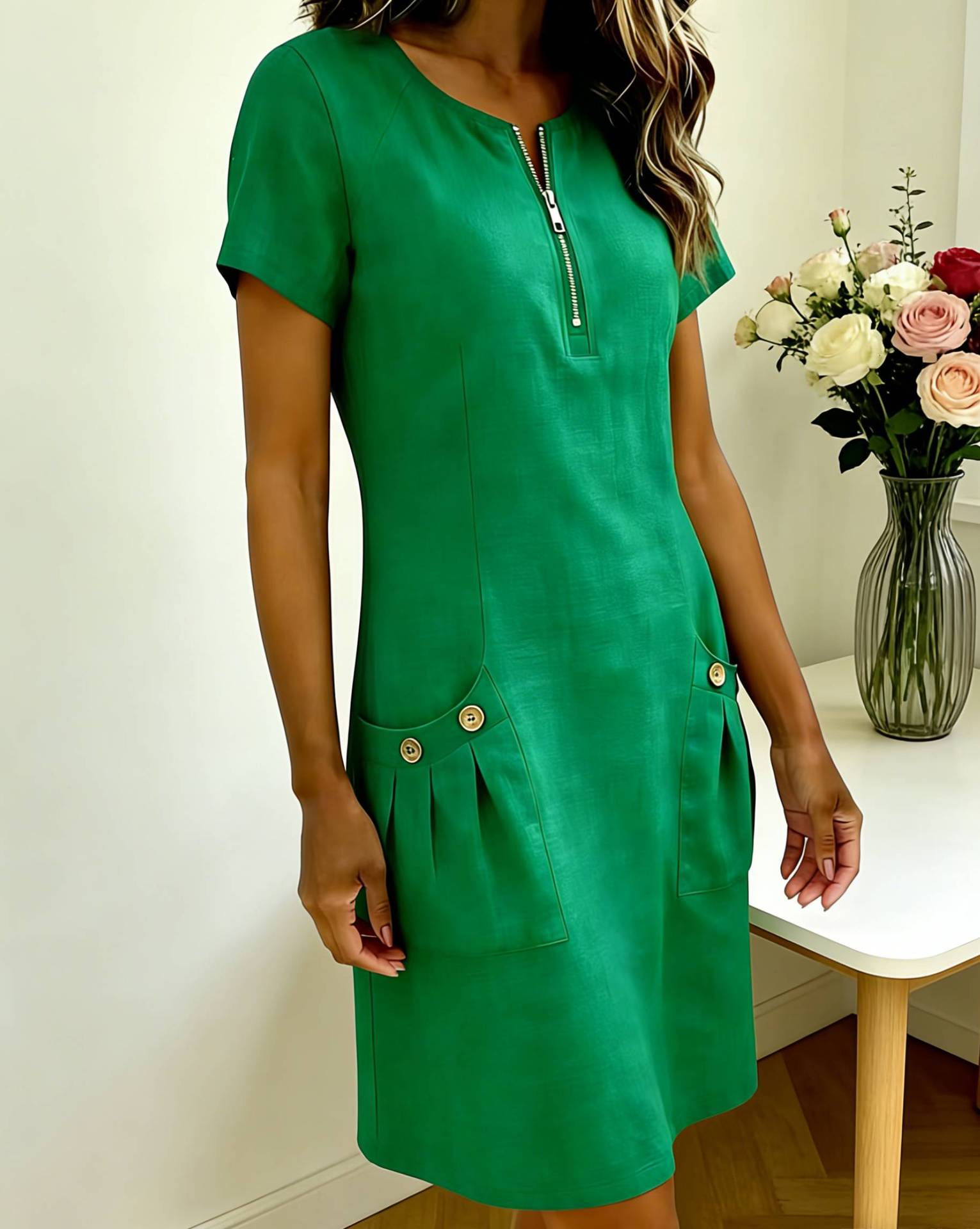 Plain Cotton Linen Short Sleeve Round Neck Zipper Pocket Button Casual Short Dress