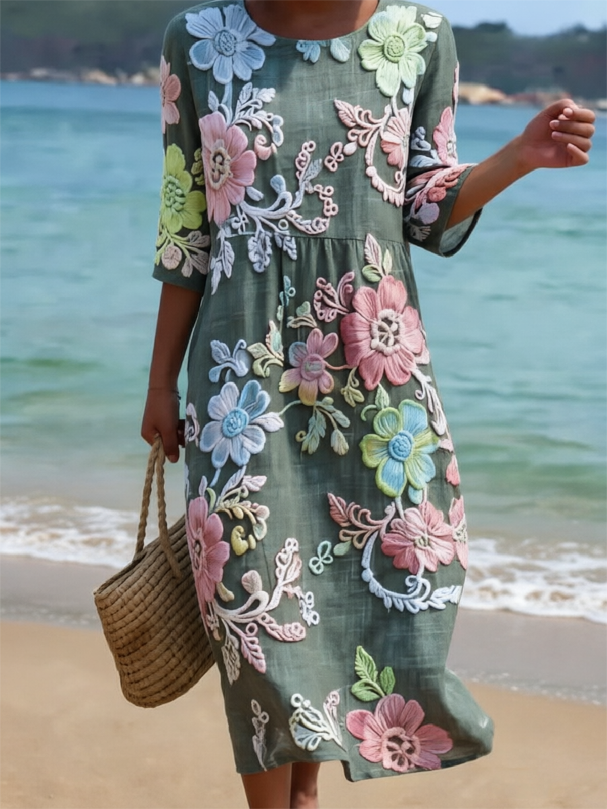 Women's Short Sleeve Summer Light Khaki Floral Printing Crew Neck Daily Going Out Casual Midi A-Line T-Shirt Dress Dress