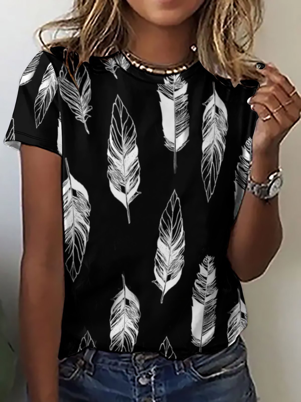 Casual Simple Feather Print Crew Neck Short Sleeve T-Shirt