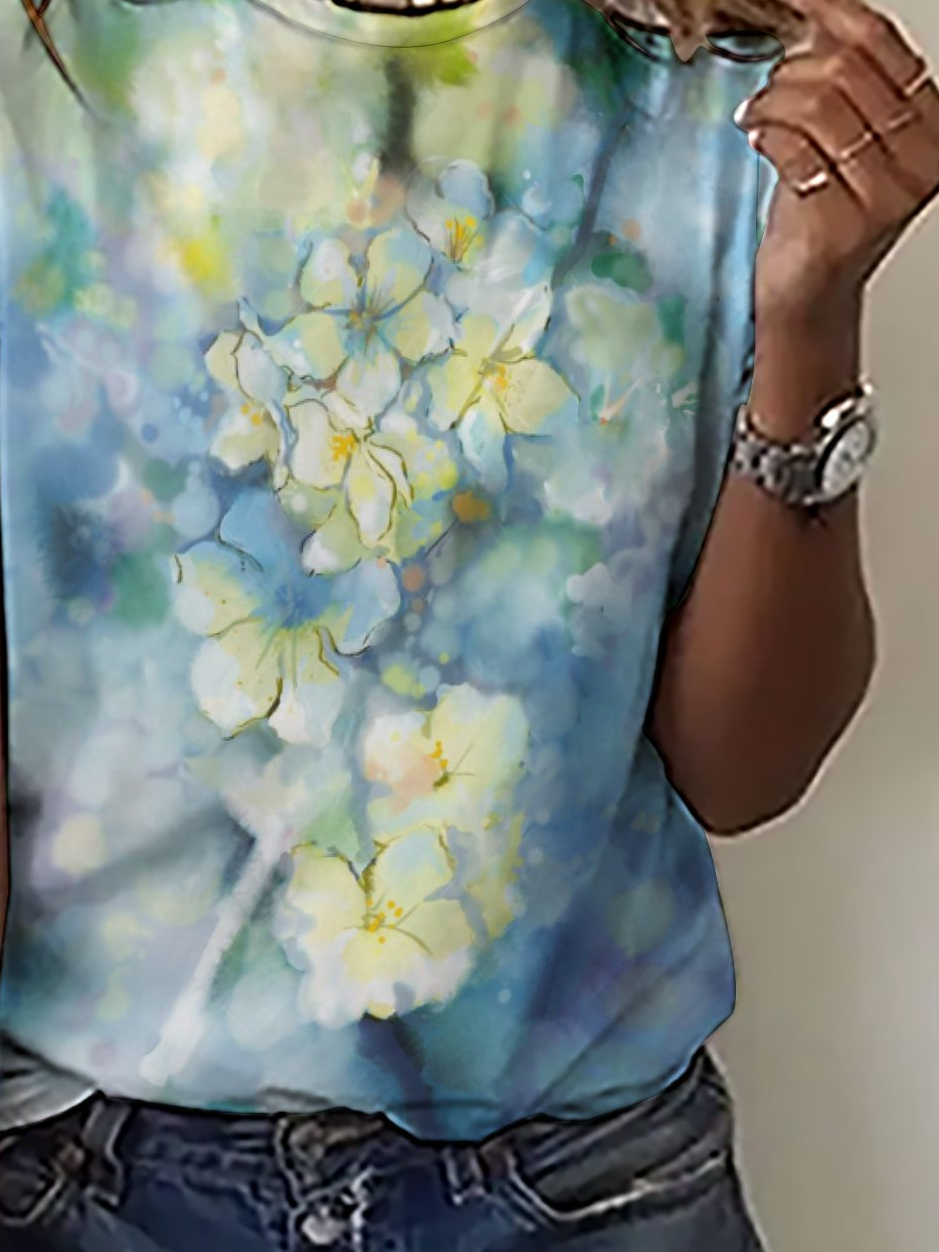 Casual Simple Floral Gradient Print Crew Neck T-Shirt