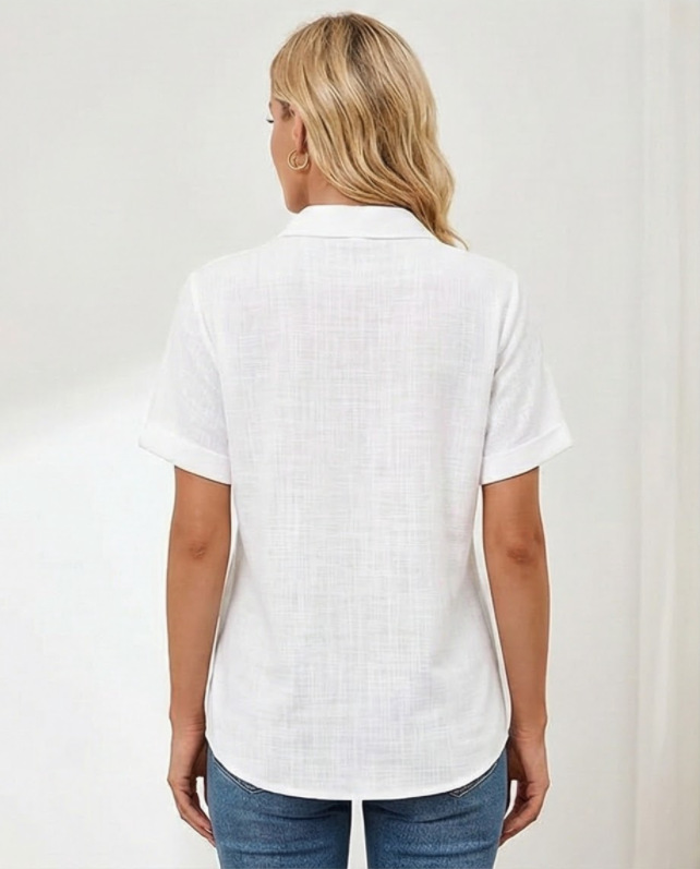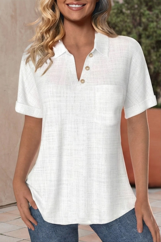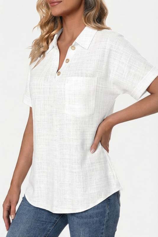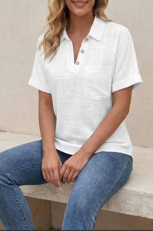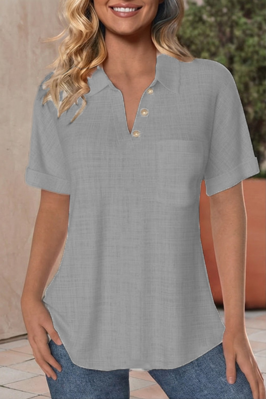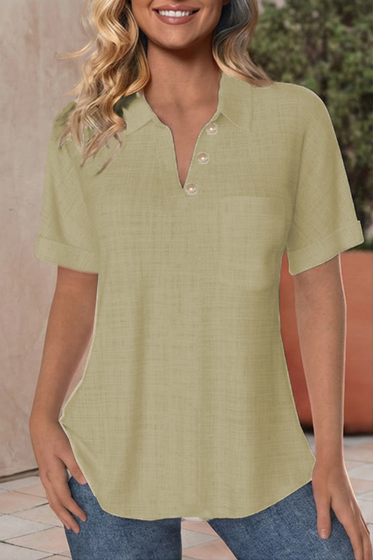Cotton And Linen Short Sleeve V-Neck Button Summer Going Out Casual Top