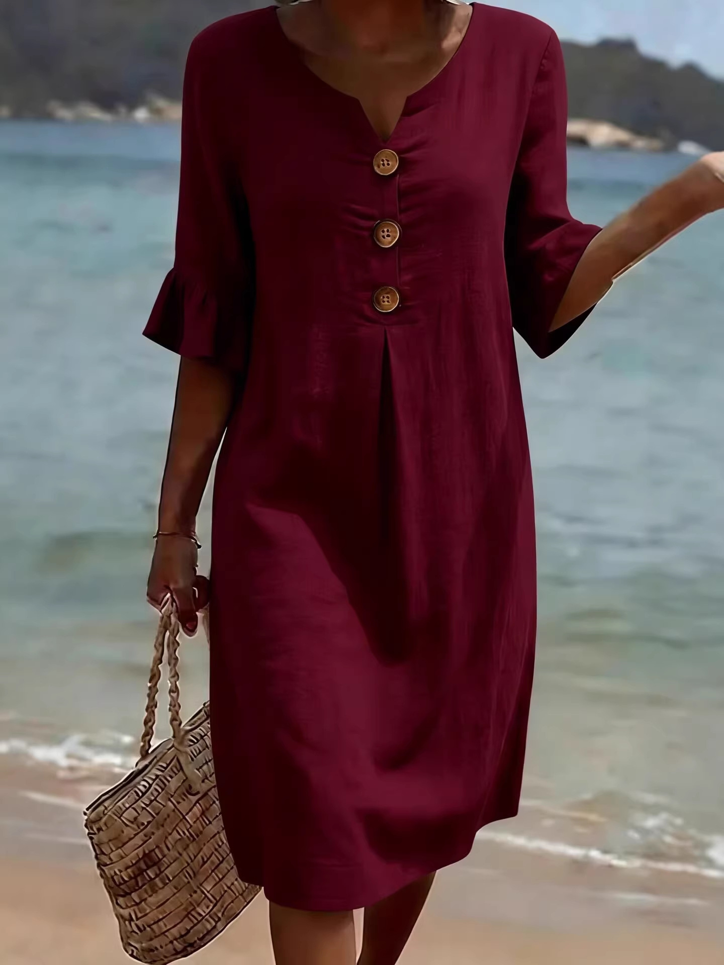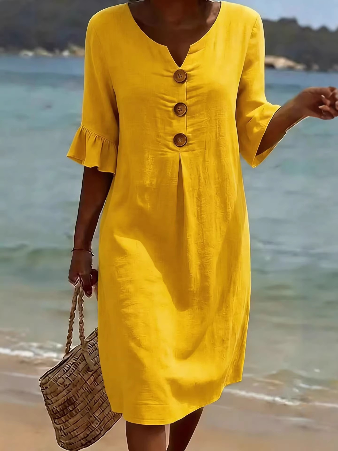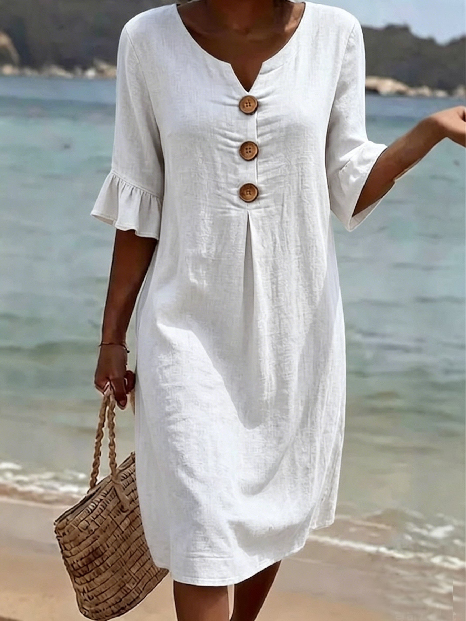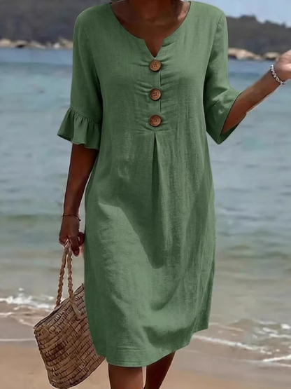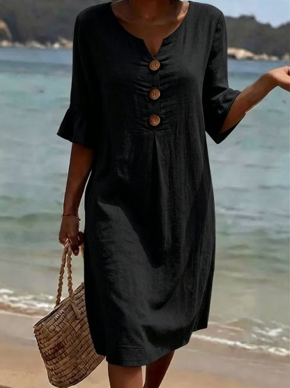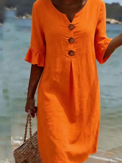 Cotton Plain V Neck Short Sleeve Button Casual Regular Fit Dress