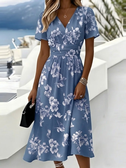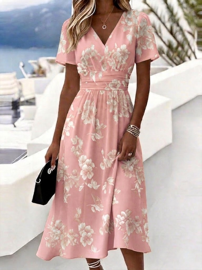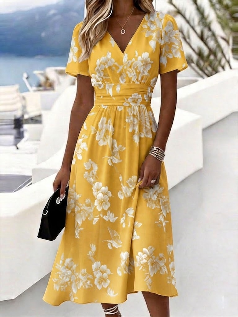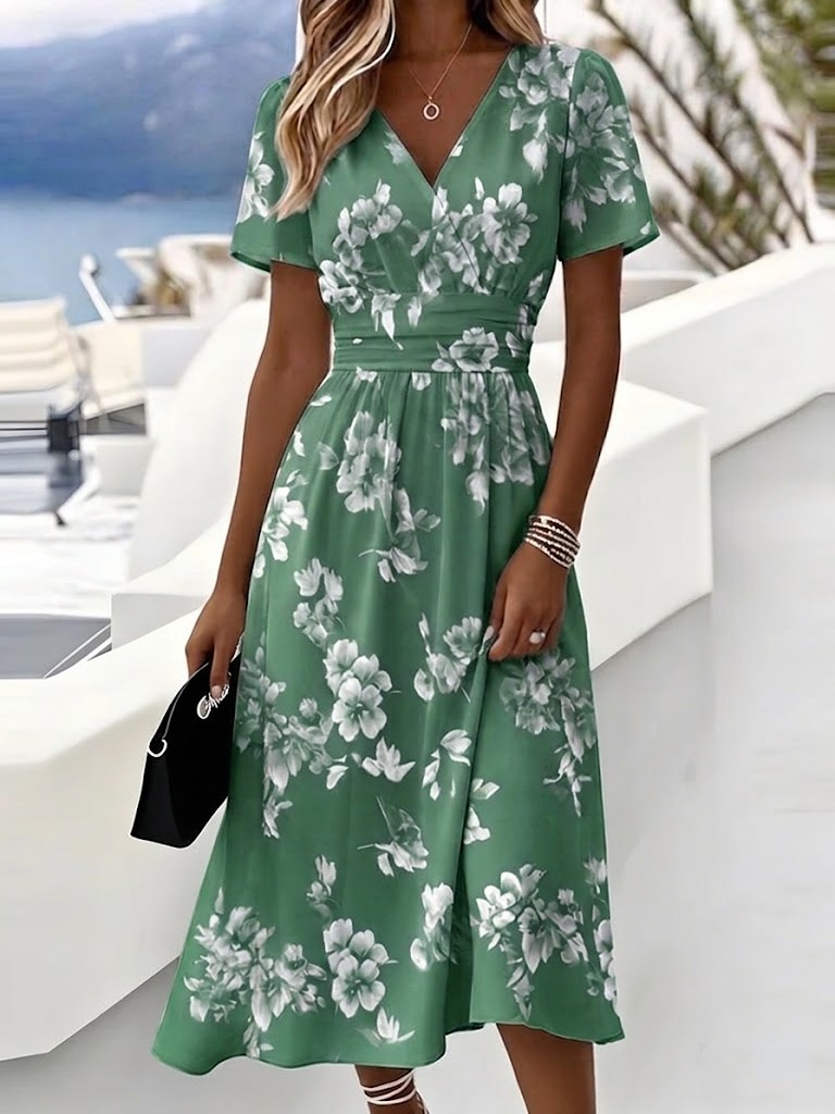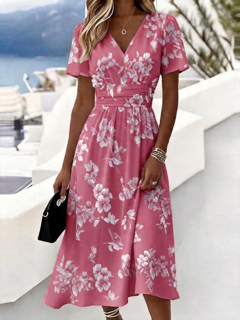 Regular Fit Floral V Neck Elegant Dress With No
