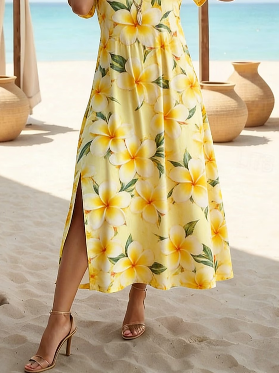 Women's Short Sleeve Summer Yellow Floral Printing Crew Neck Daily Going Out Casual Maxi H-Line T-Shirt Dress Dress