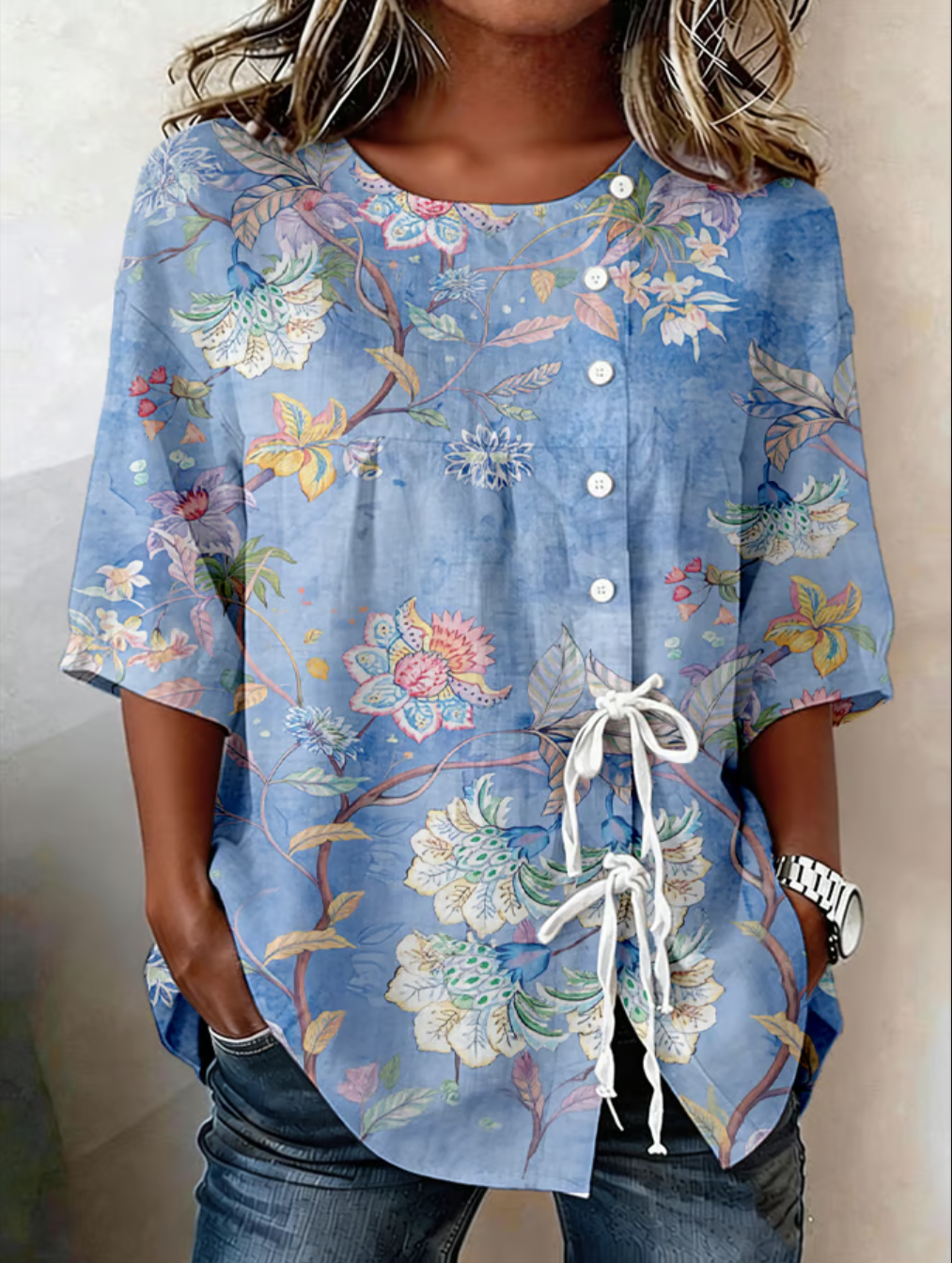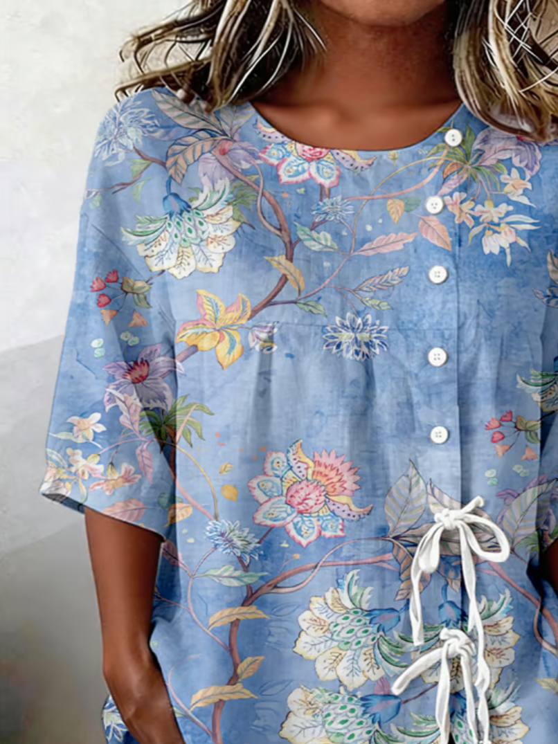 Elegant Botanical Pattern Loose Crew Neck Blouse