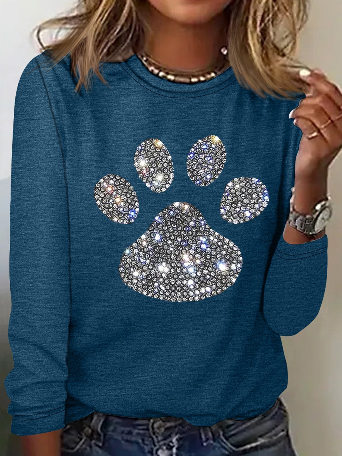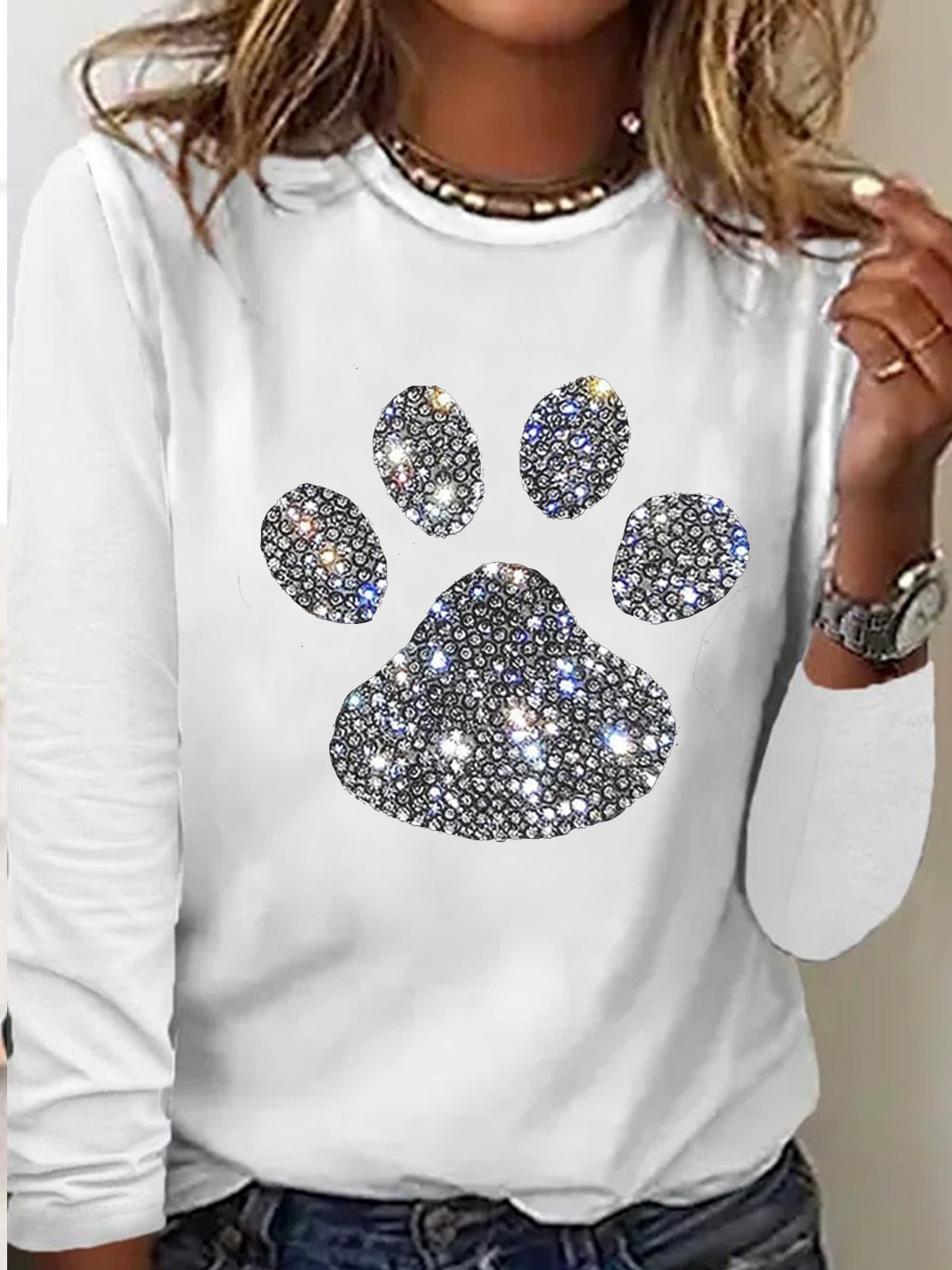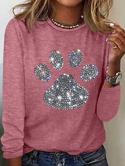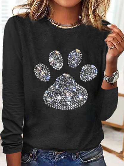 Women's Dog Paw Rhinestone Print Crew Neck Casual Letters Top