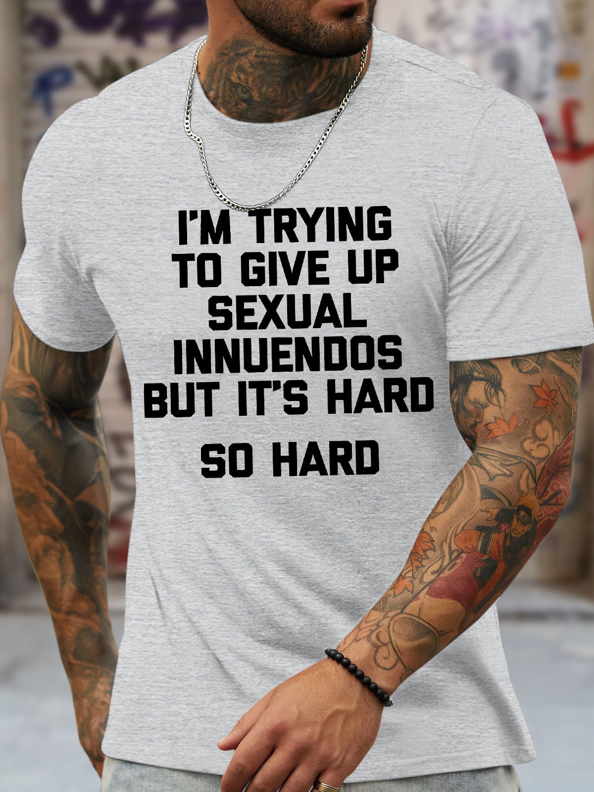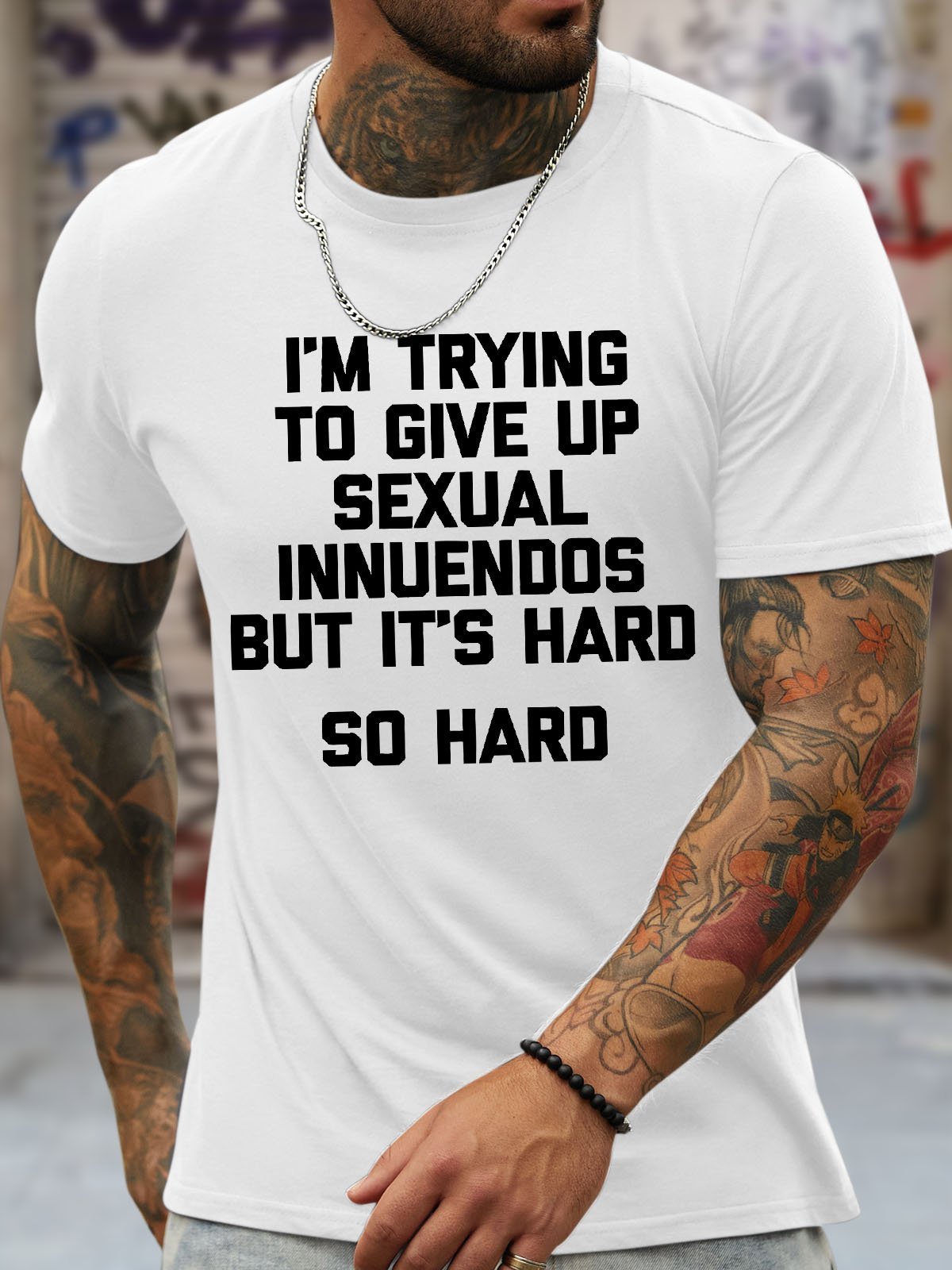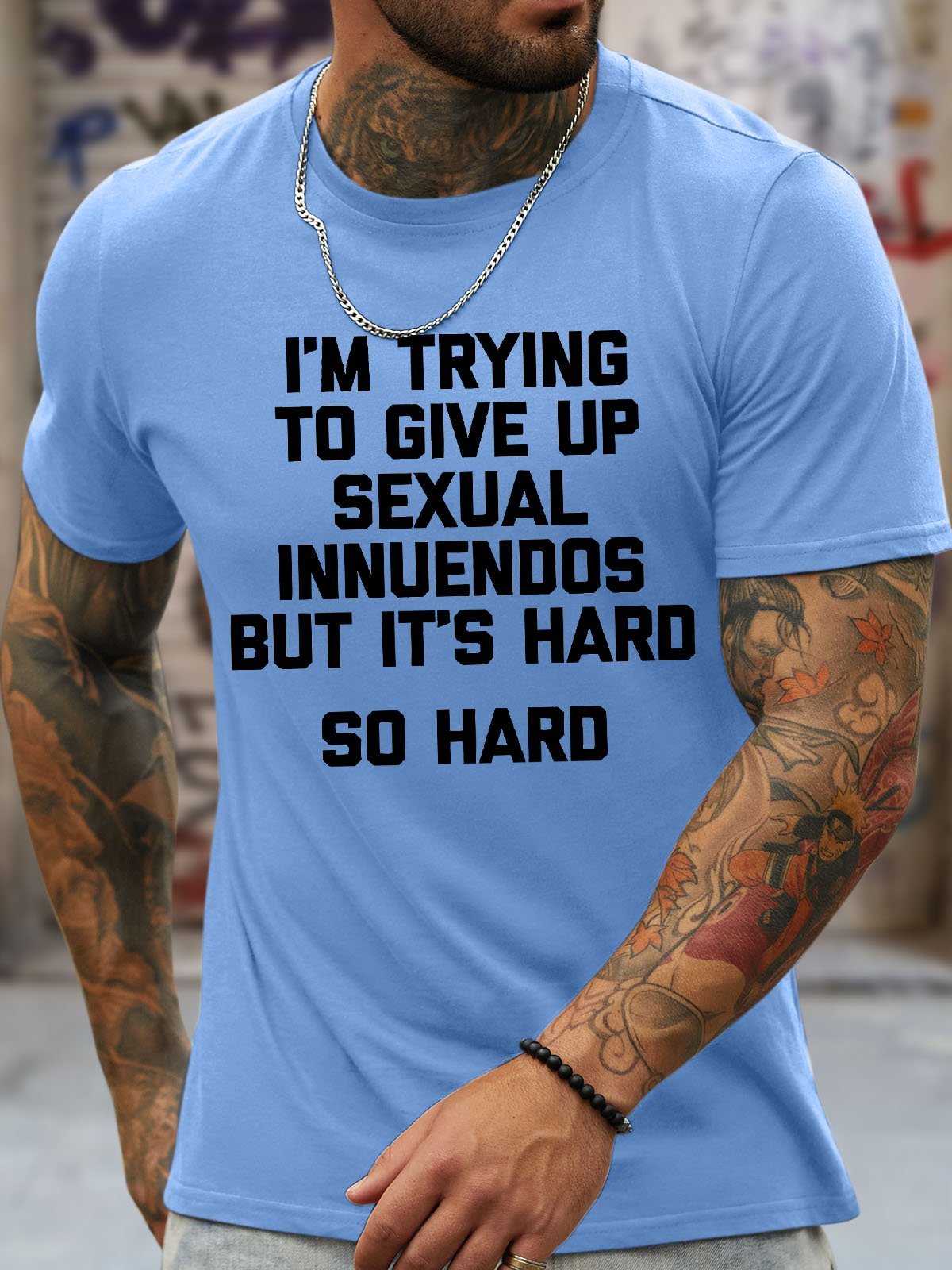 Men's Funny I Am Trying To Give Up Sexual Innuendos But It'S Hard So Hard Graphic Printing Casual Loose Crew Neck Cotton T-Shirt
