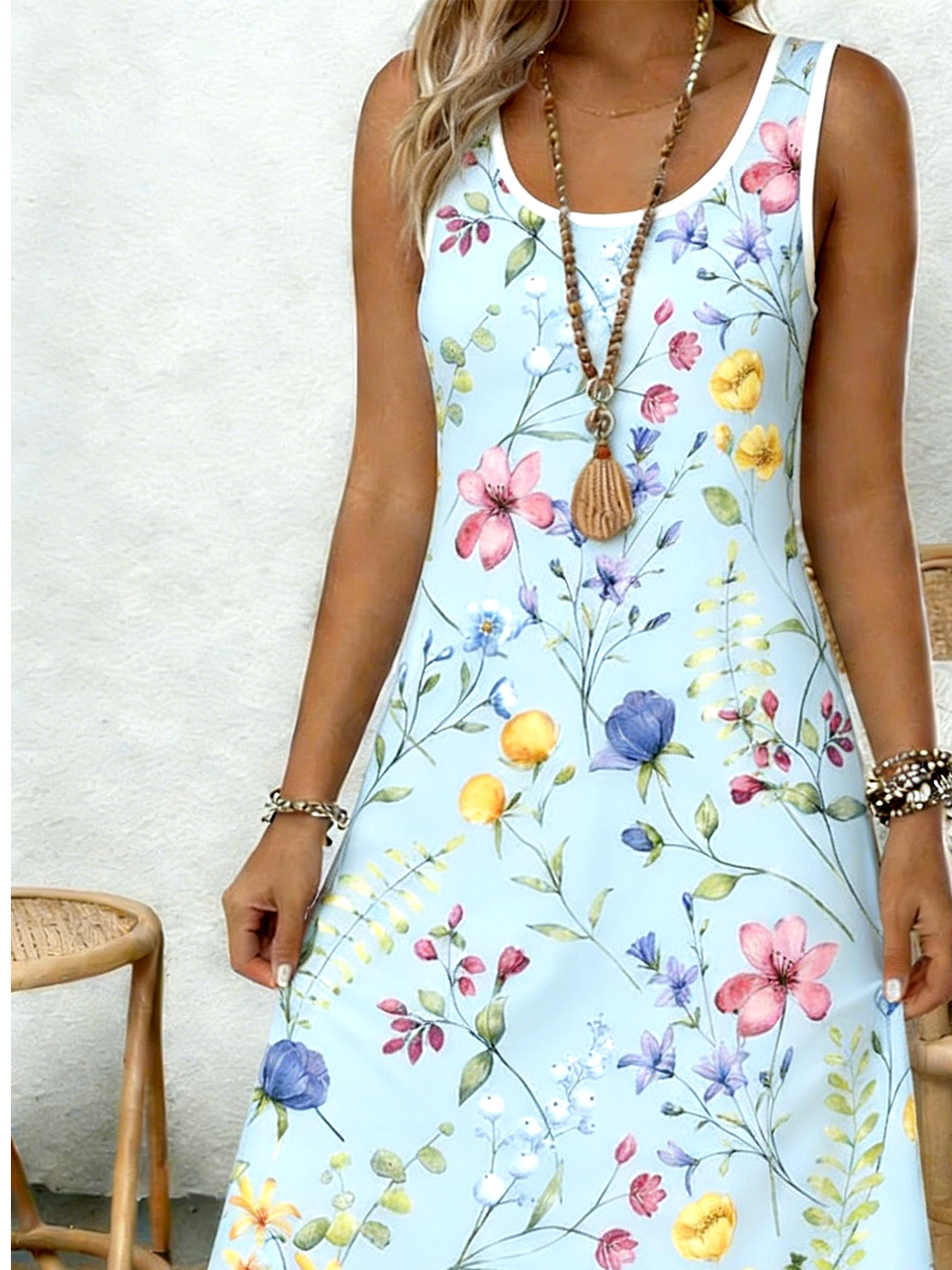 Casual Floral Cotton Crew Neck Dress With No