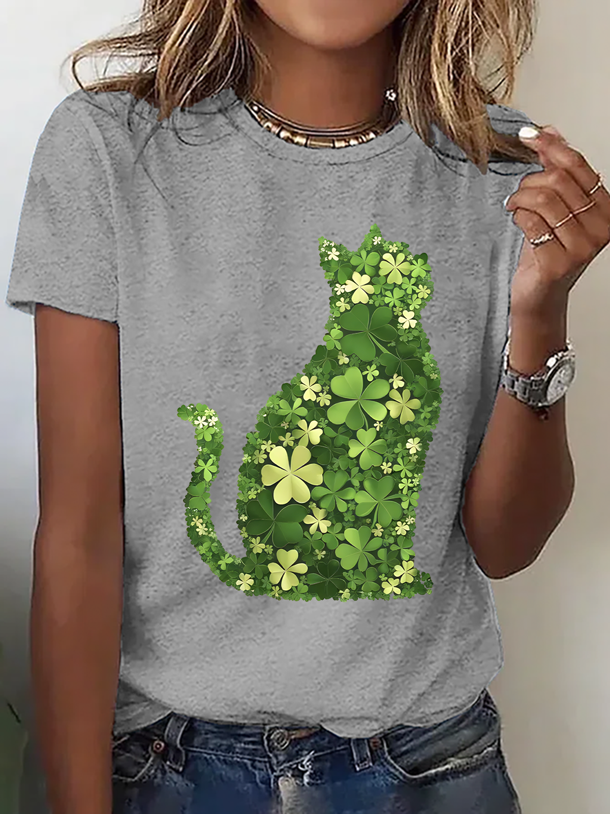 Cat On Four Leaf Clover Heart Cotton T-Shirt