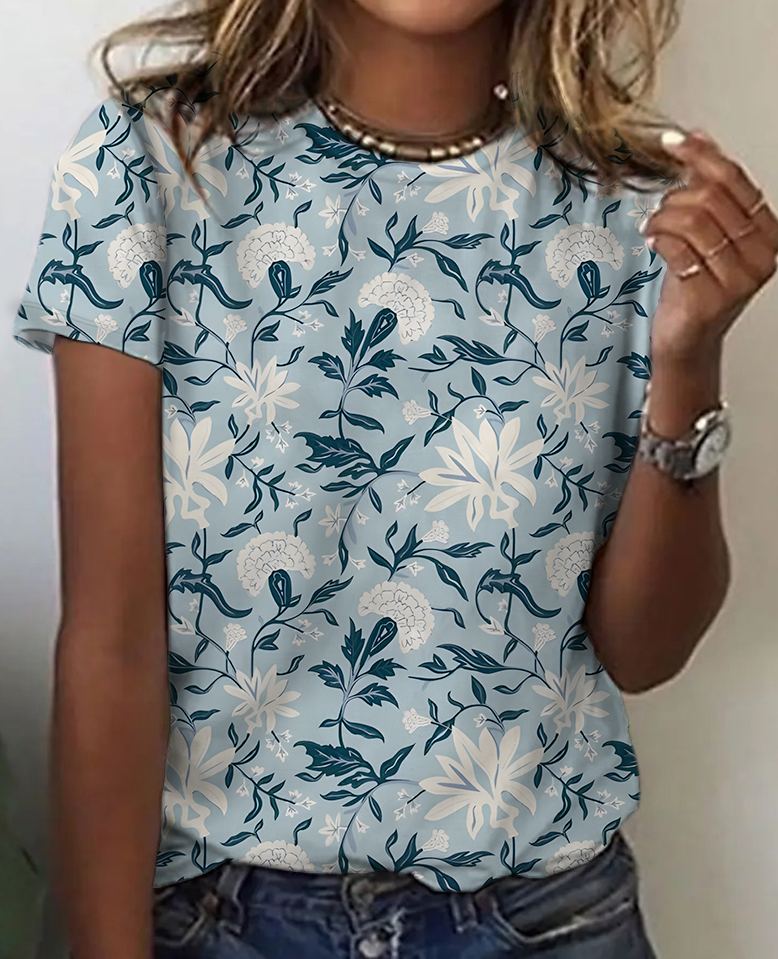 Floral Contrast Short-Sleeved Top Cotton T-Shirt