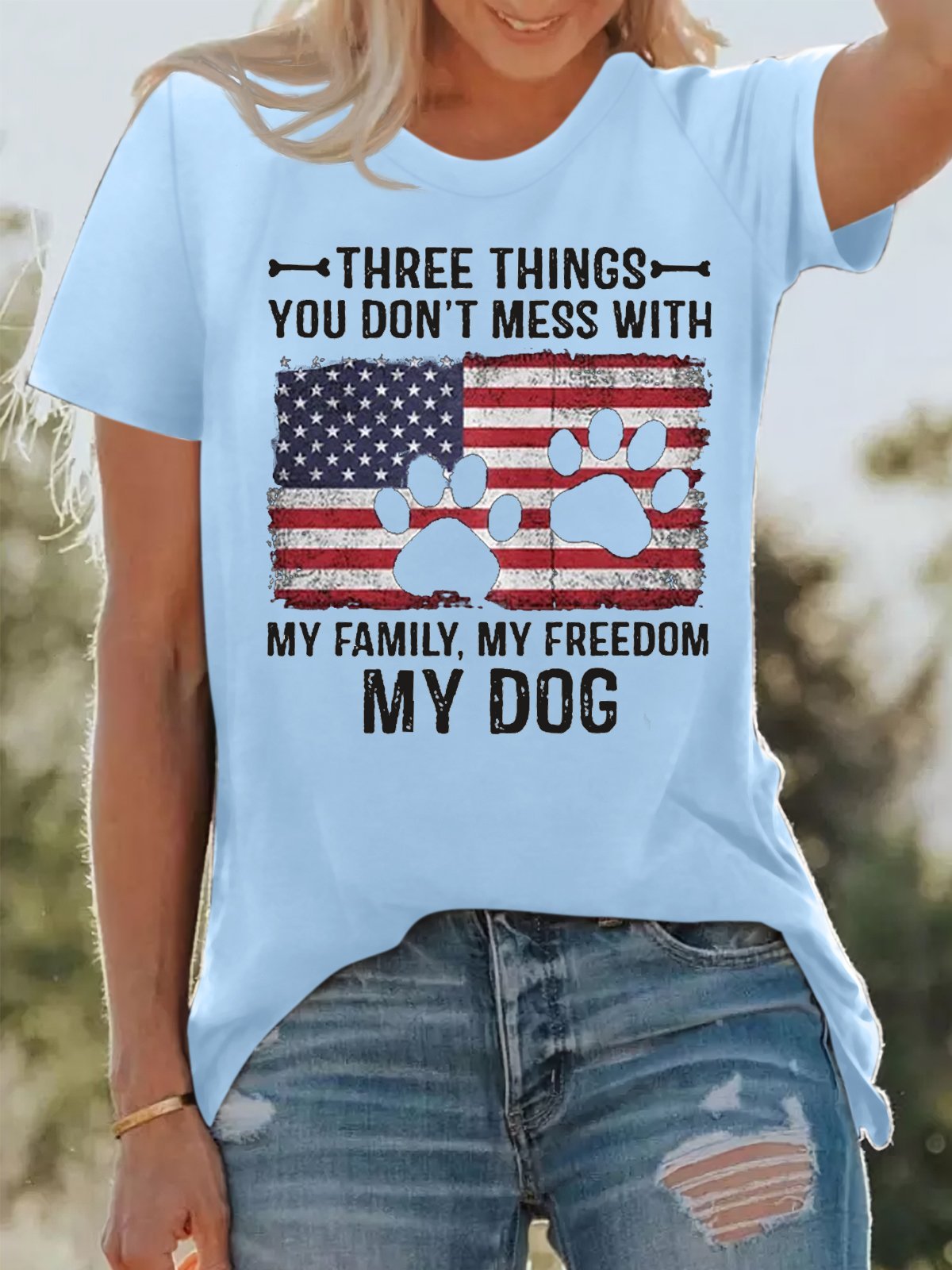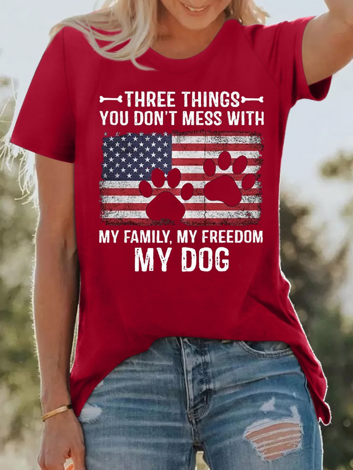 Women's Cotton Three Things You Don't Mess With My Family My Freedom My Dog Print T-Shirt