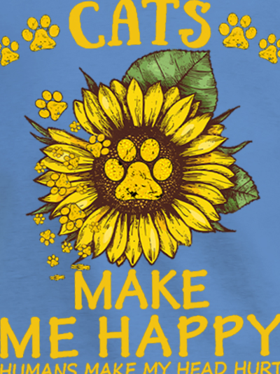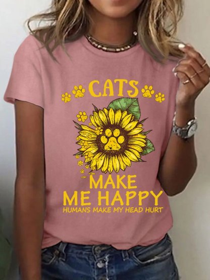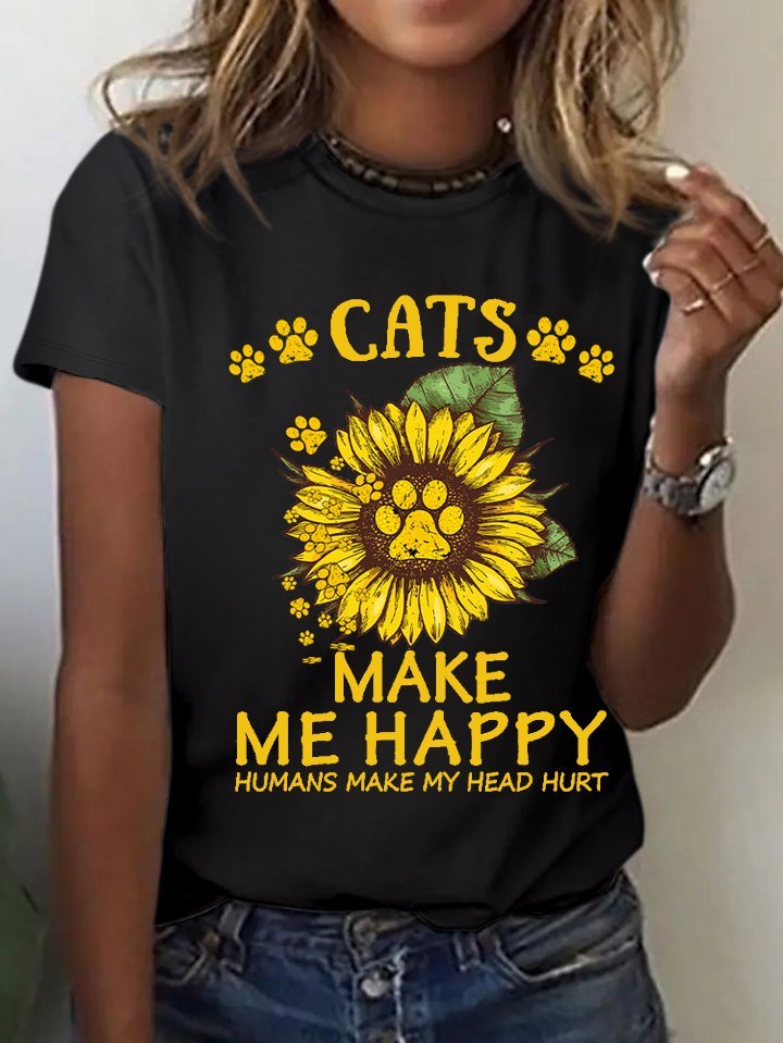 Women Sunflower Paws Cats Make Me Happy Humans Make Me Head Hurt Cotton Loose Simple T-Shirt