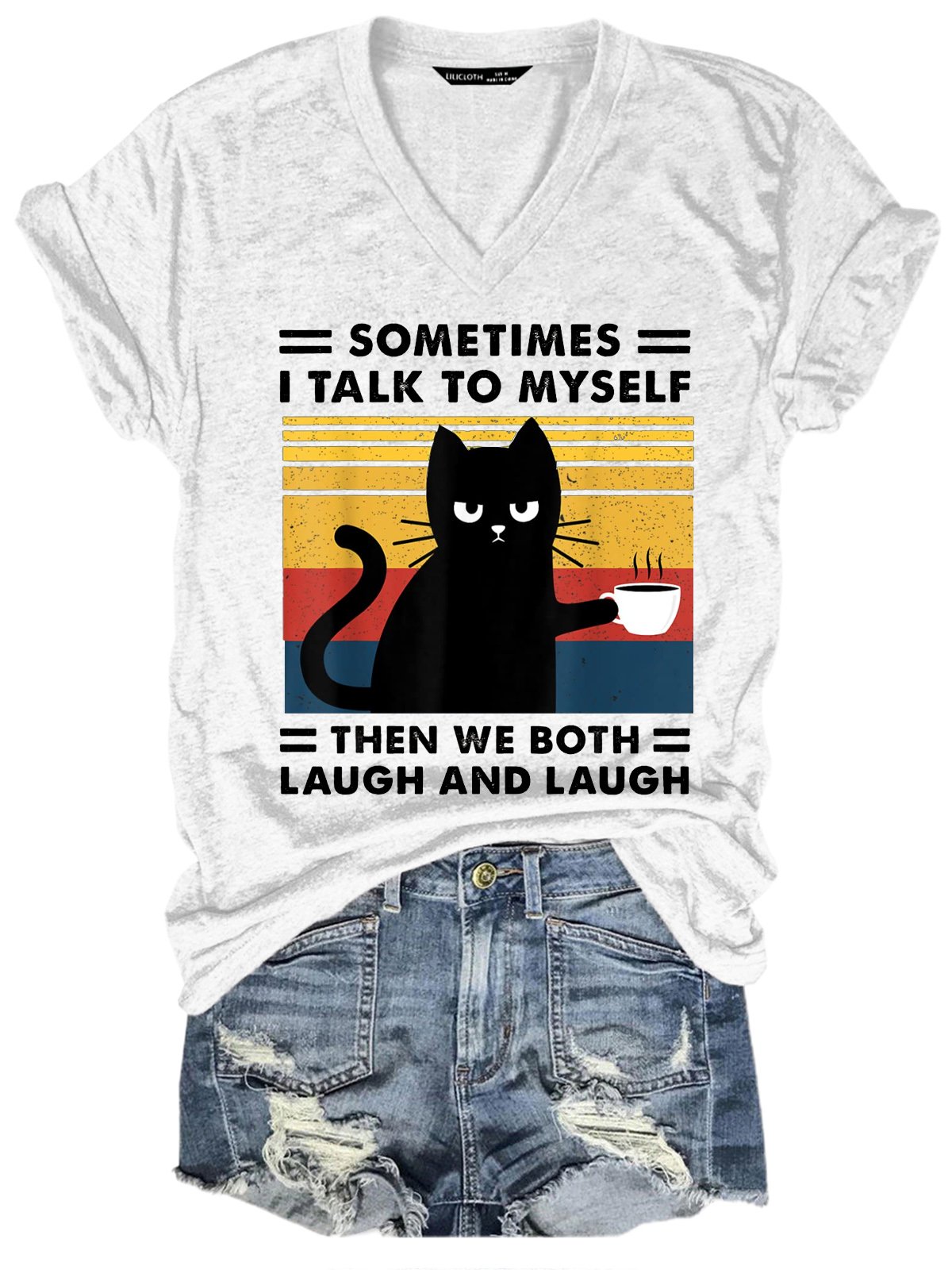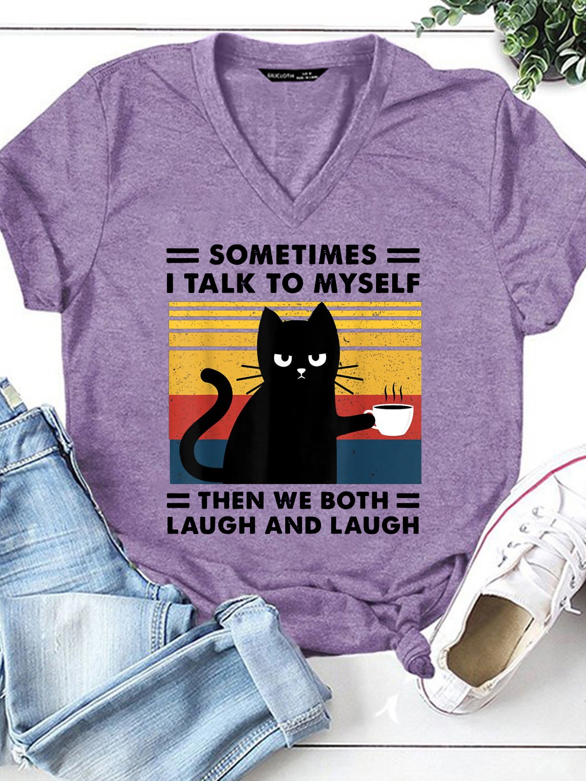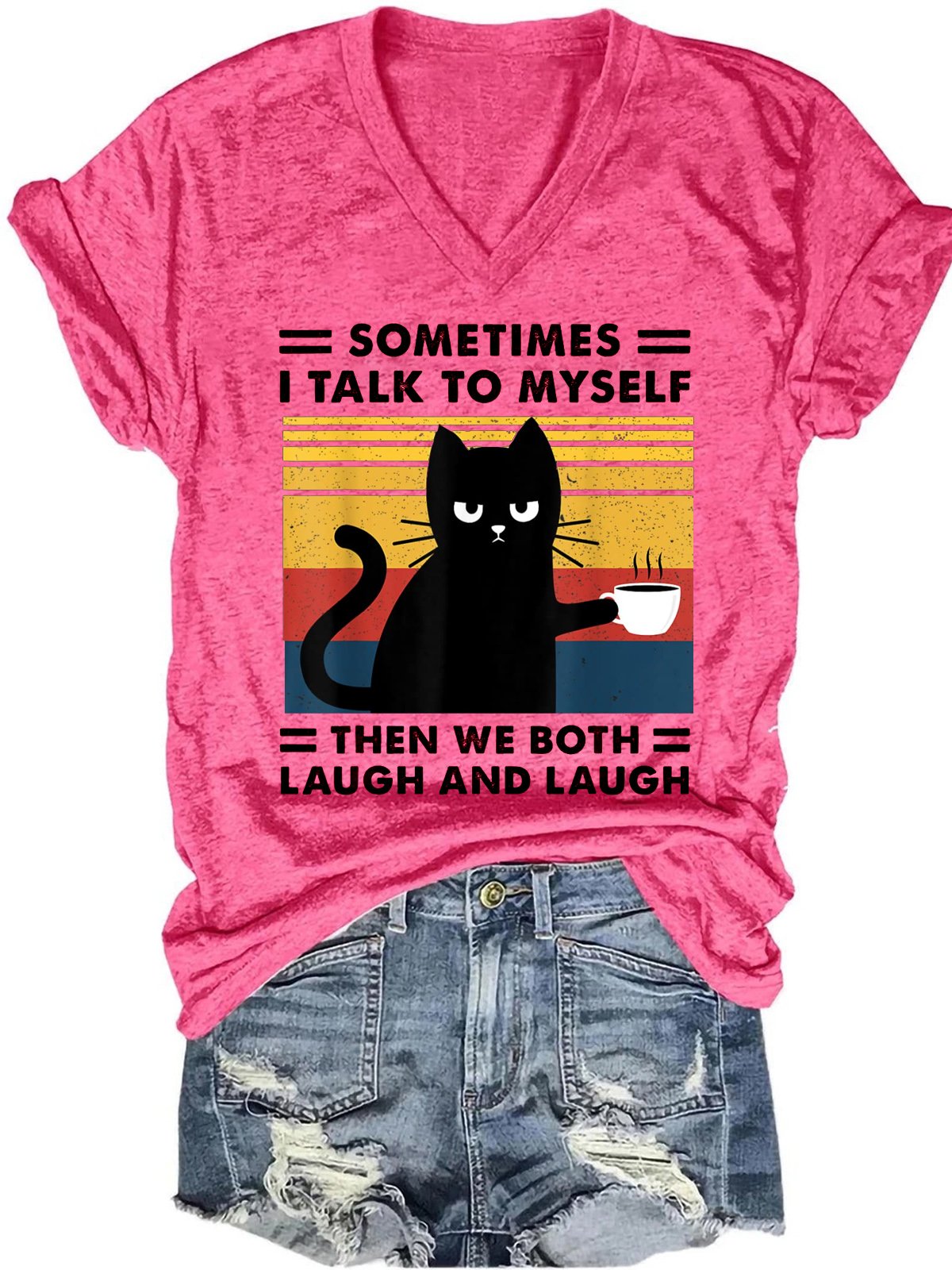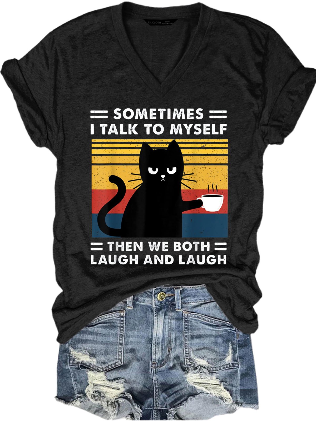 Womens Sometimes I Talk To Myself Then We Both Laugh Black Cat Casual T-Shirt