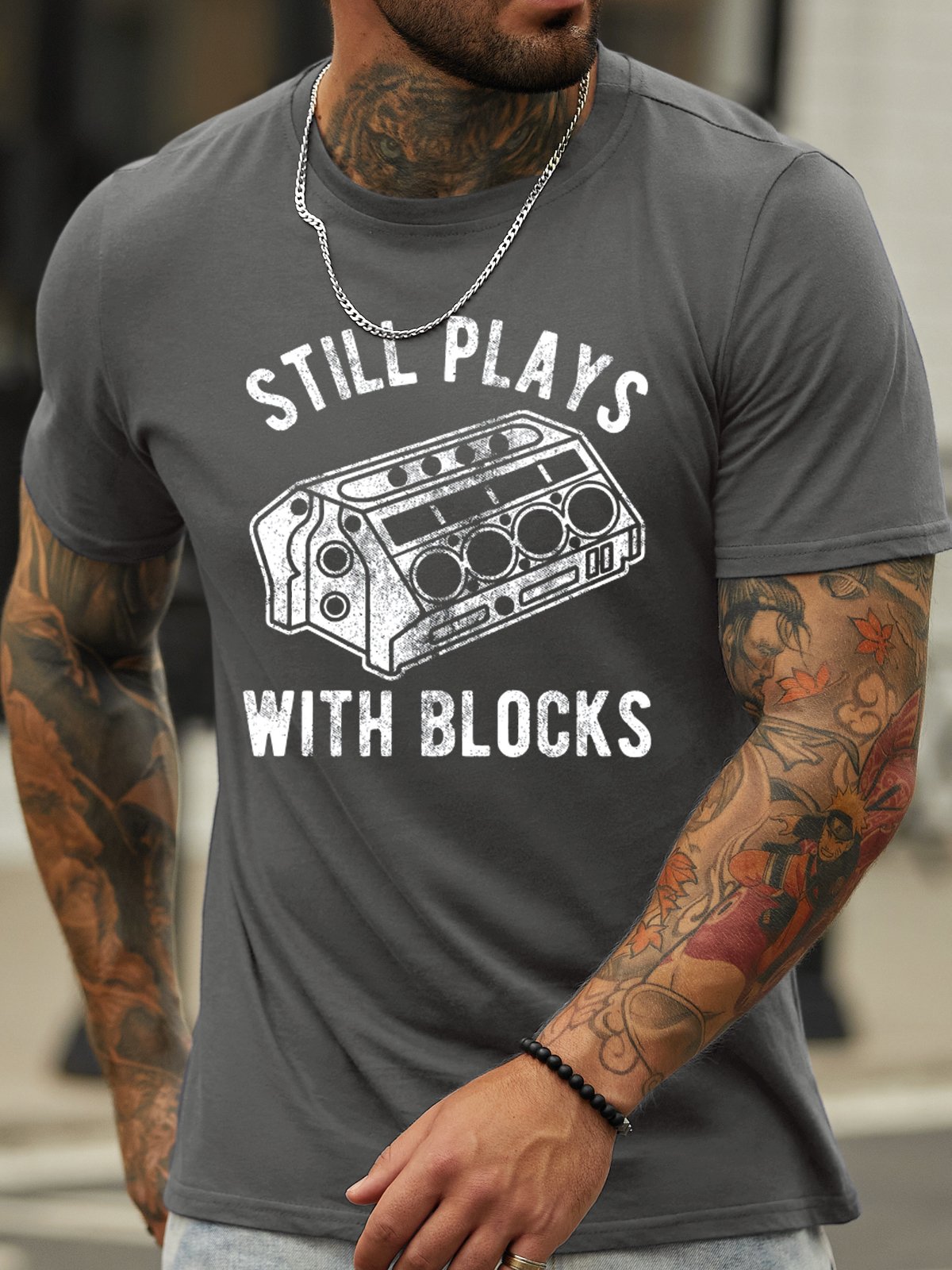 Men's Still Plays With Blocks Funny Graphic Print Casual Crew Neck Cotton Loose T-Shirt