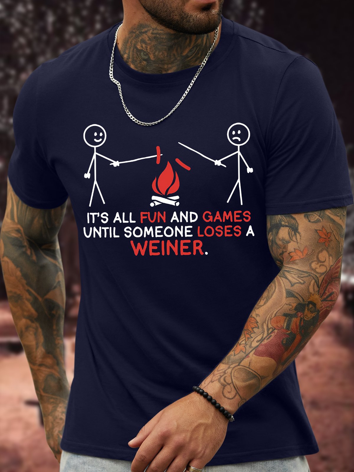 Men's It Is All Fun And Games Until Someone Loses A Weiner Funny Play Fire Graphic Print Loose Cotton Casual Text Letters T-Shirt