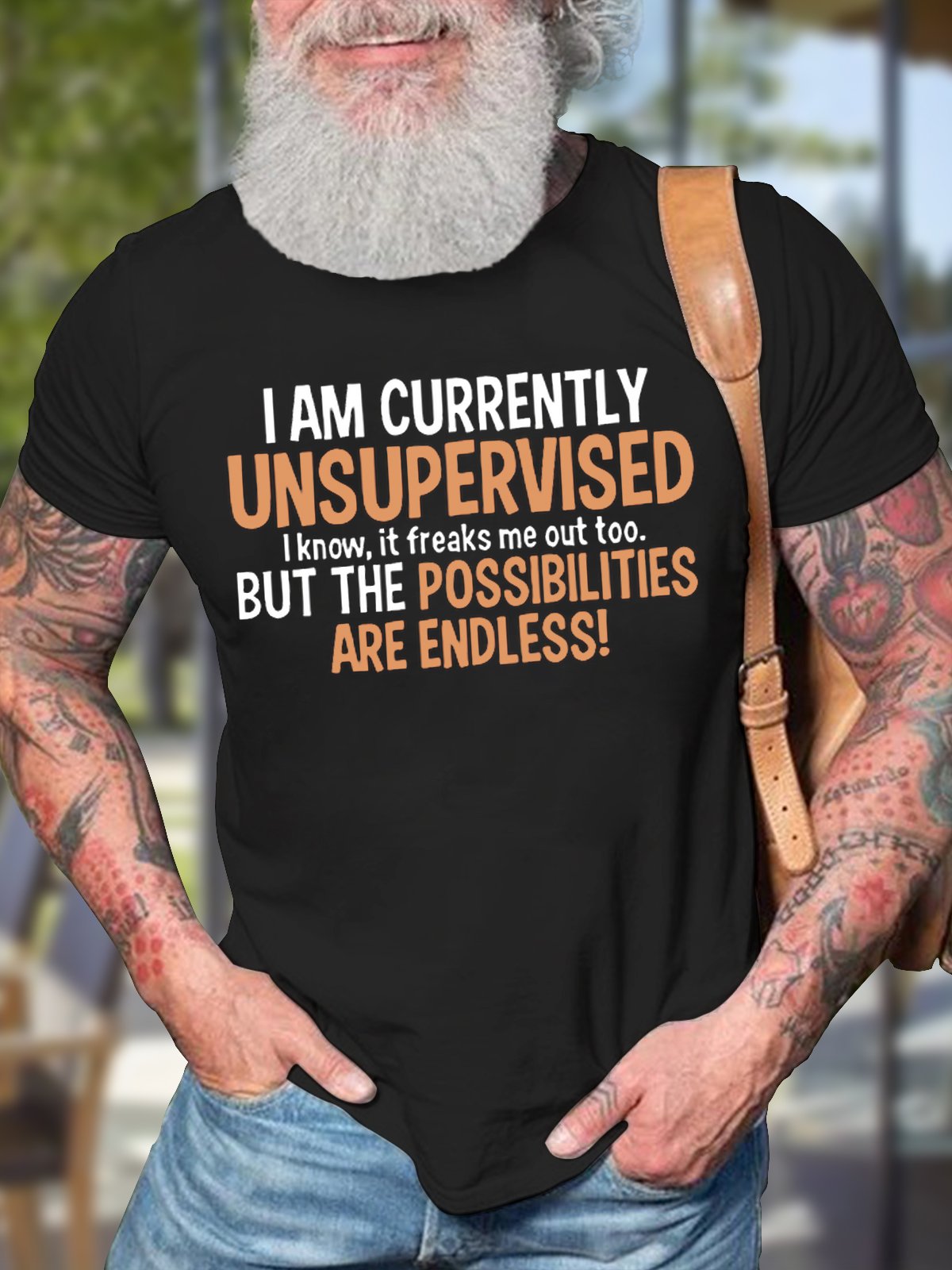 Men's I Am Currently Unsupervised I Know It Freaks Me Out Too But The Possibilities Are Endless Funny Graphic Print Text Letters Cotton Casual Loose T-Shirt