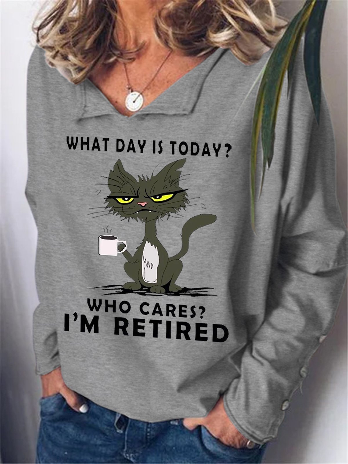 Women Funny What Day Is Today Who Cares I‘m Retired Black Cat Text Letters Sweatshirt