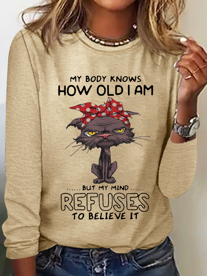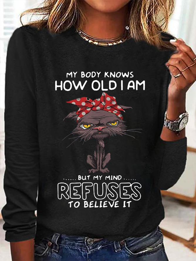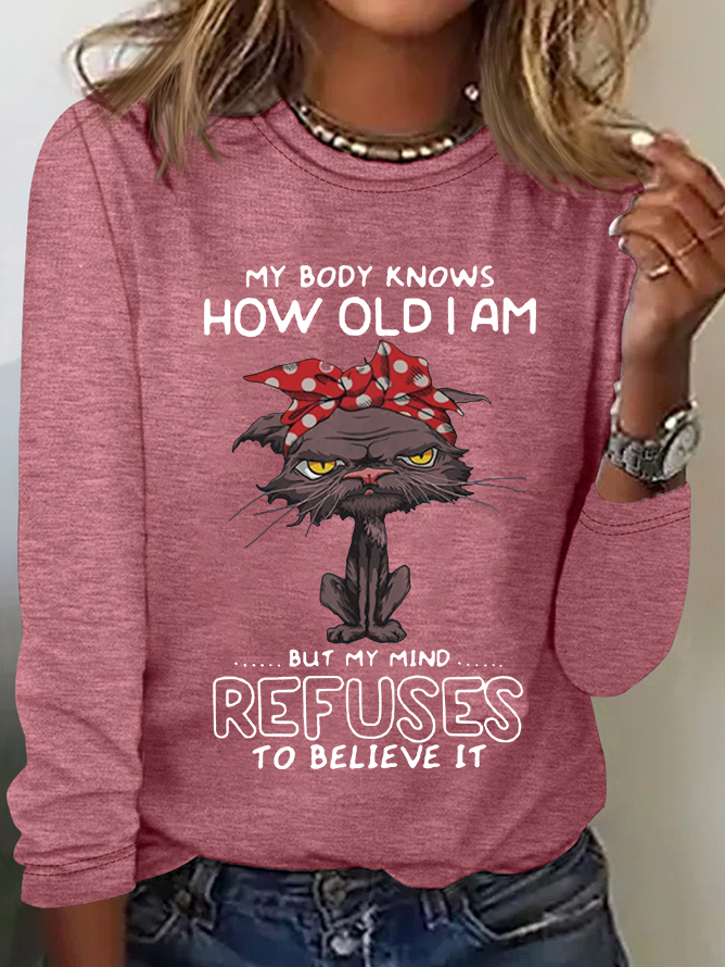 Cat Lovers My Body Knows How Old I Am But My Mind Refuses To Believe It Simple Crew Neck Long Sleeve Shirt