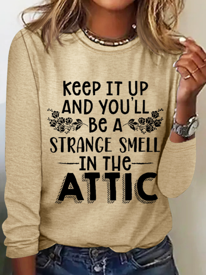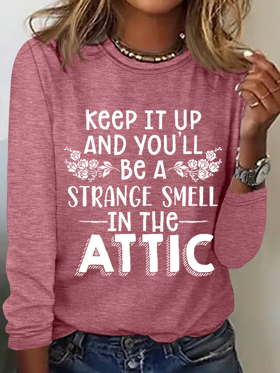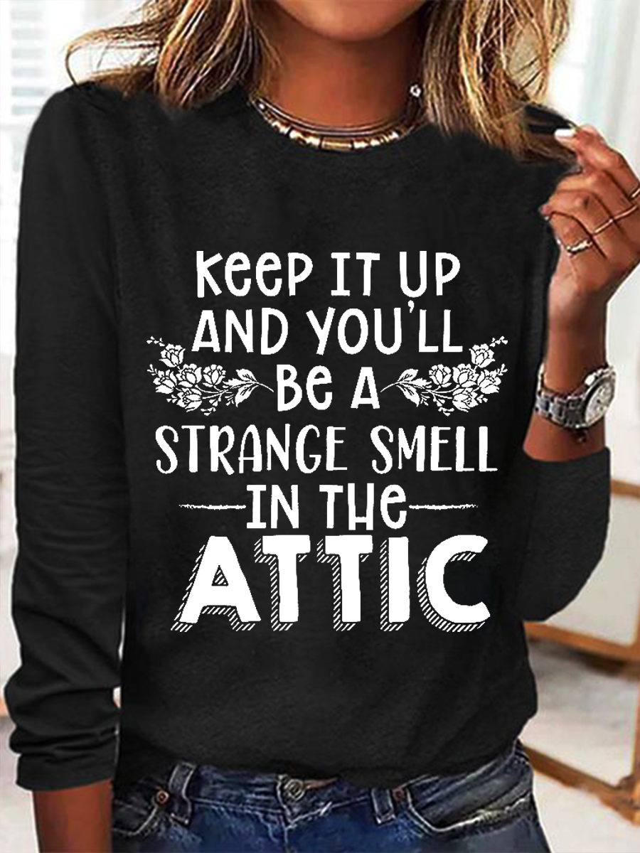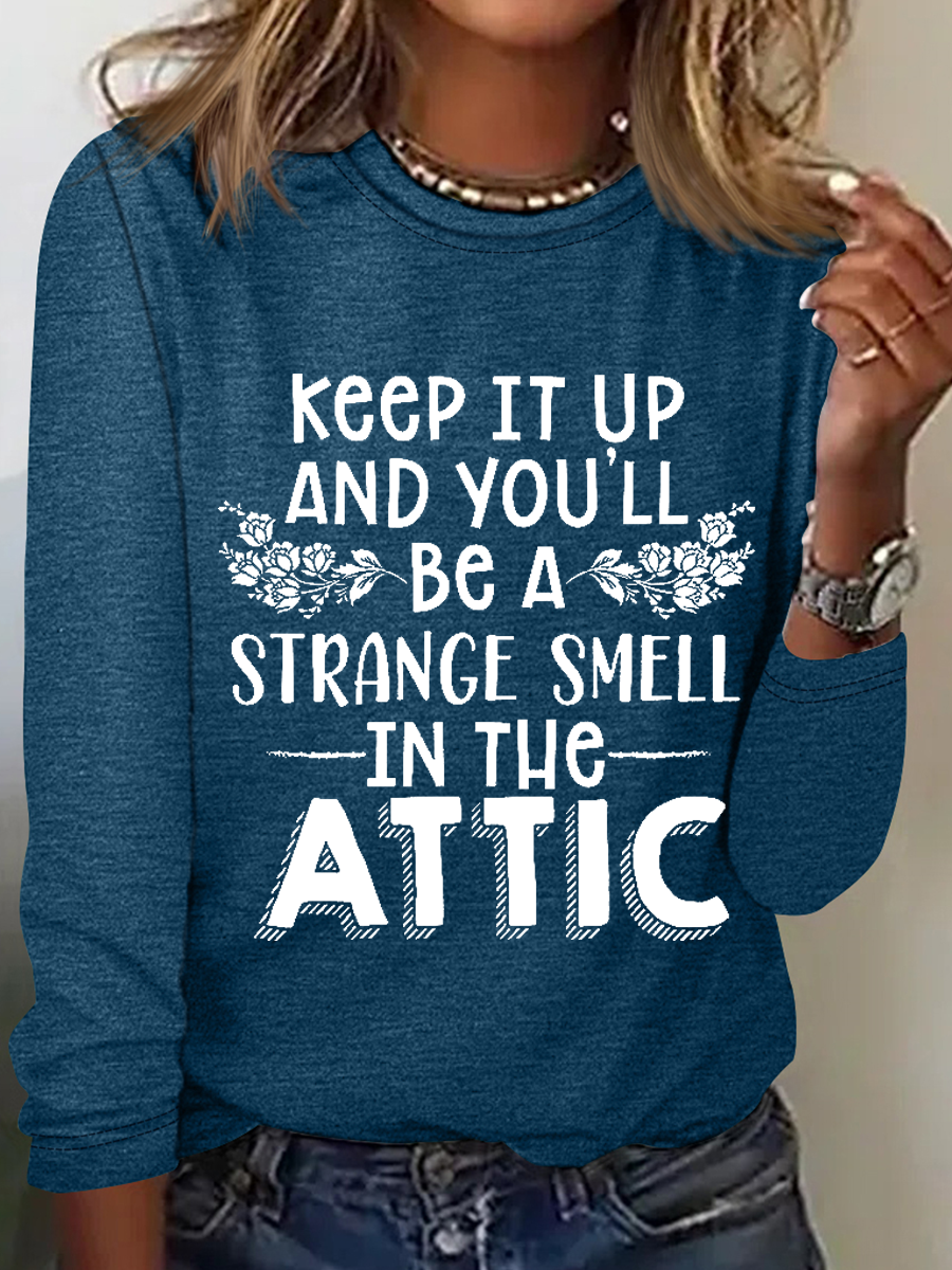 Keep It Up & You'll Be A Strange Smell In The Attic Simple Regular Fit Cotton-Blend Crew Neck Long Sleeve Shirt