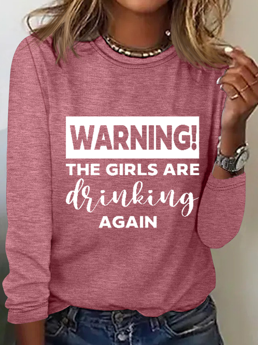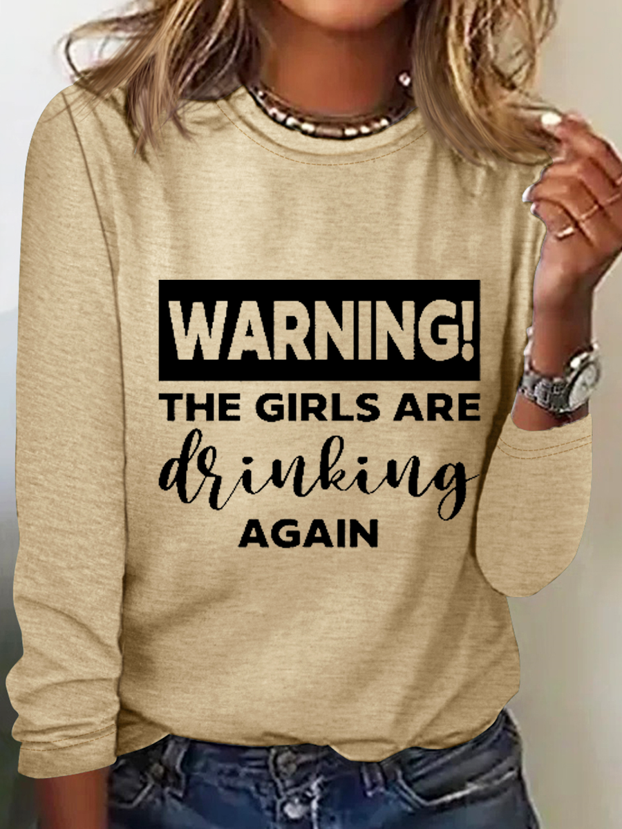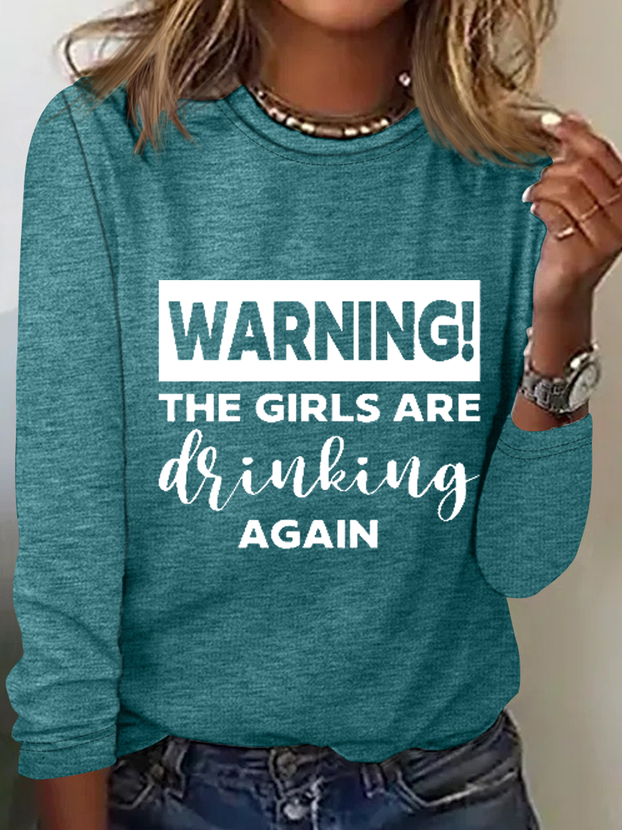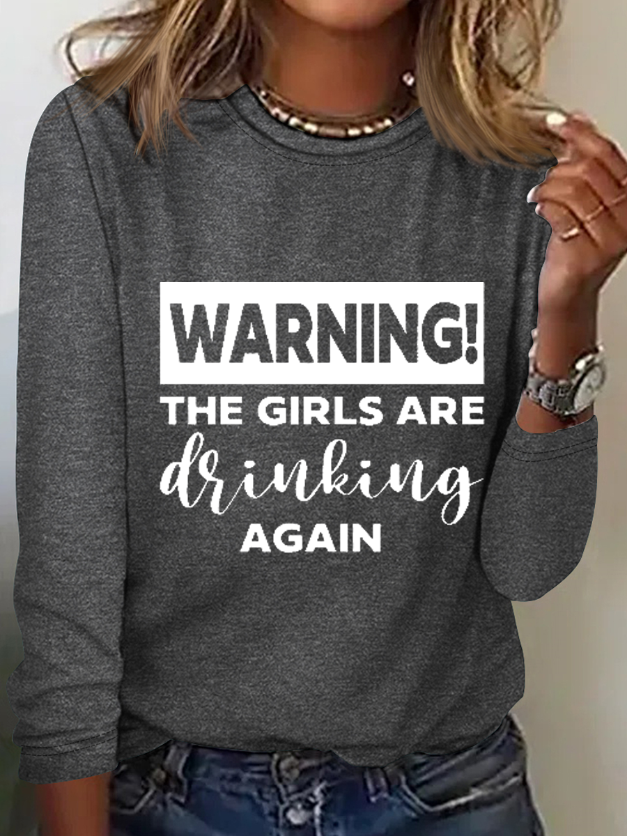 Warning The Girls Are Drinking Again Crew Neck Text Letters Simple Long Sleeve Shirt