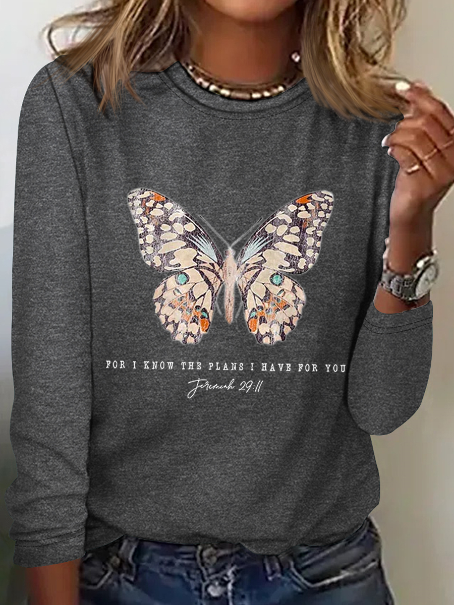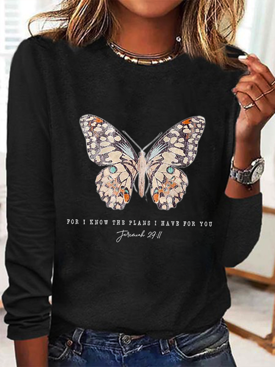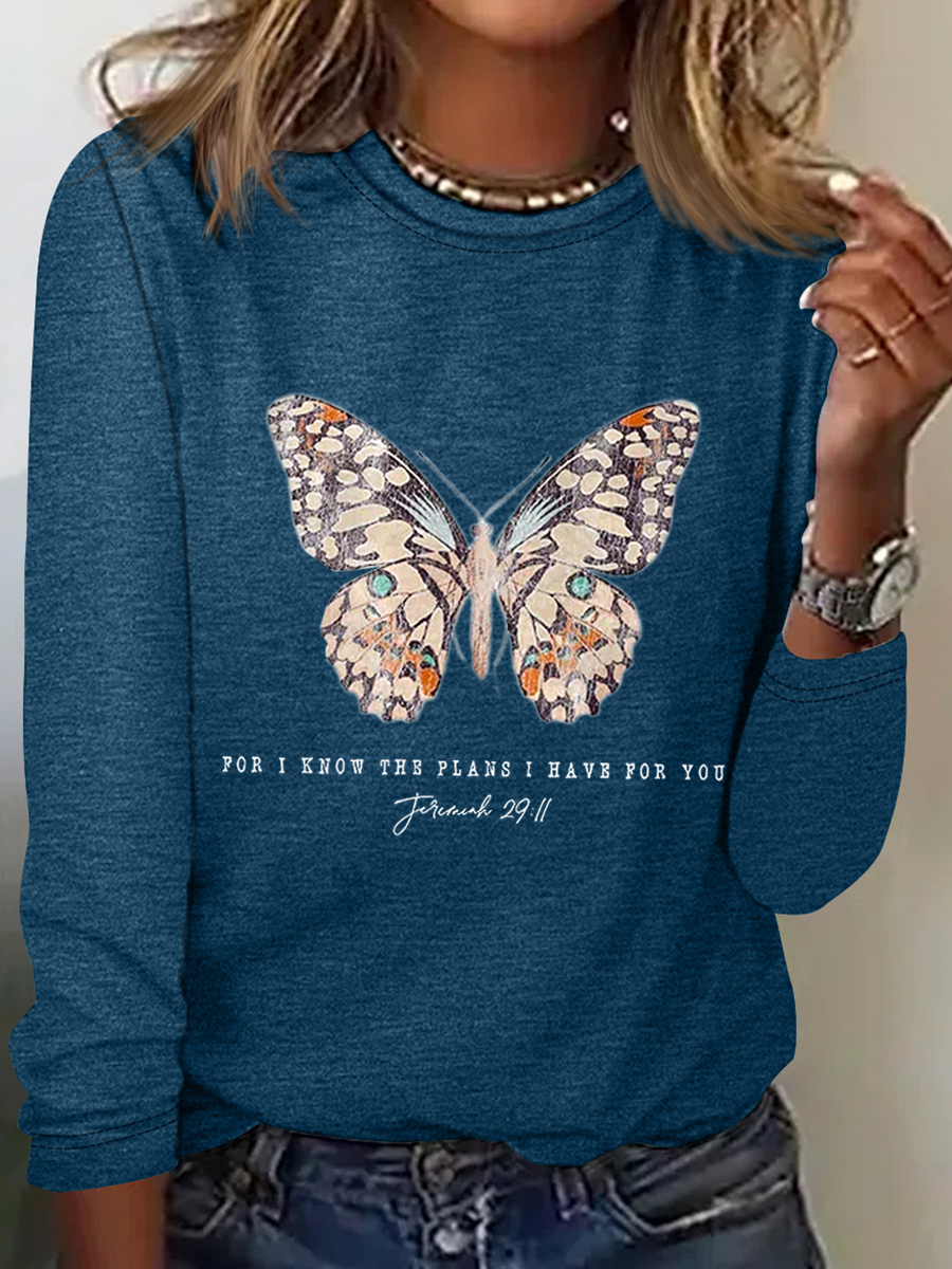 Women's Casual Jeremiah 29 11 For I Know the Plans I Have For You Print Cotton-Blend Crew Neck Butterfly Long Sleeve Shirt