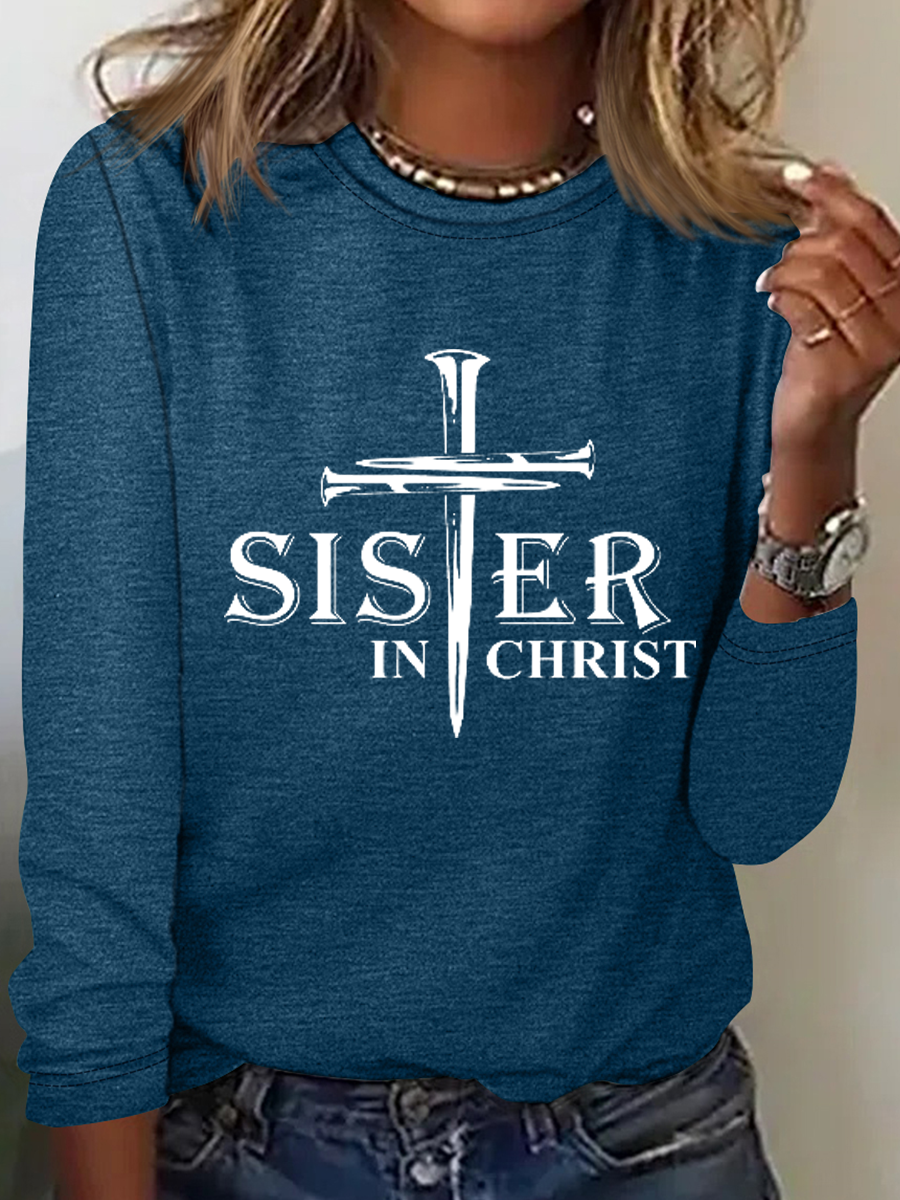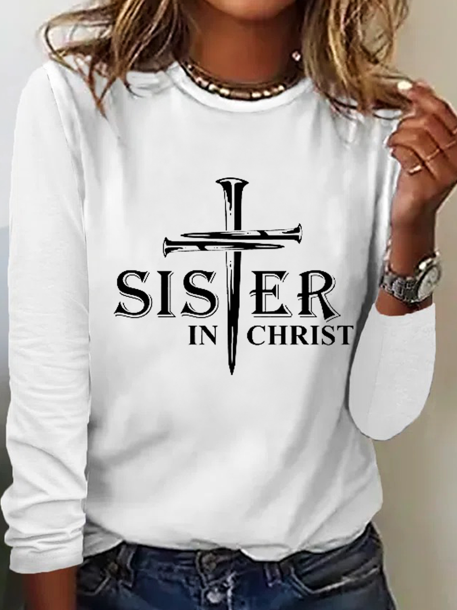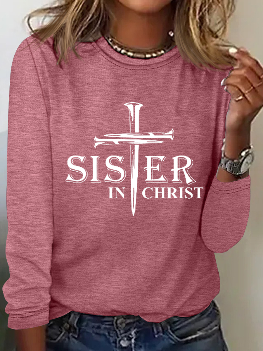 Women's Sisters In Christ Print Simple Text Letters Cotton-Blend Long Sleeve Shirt