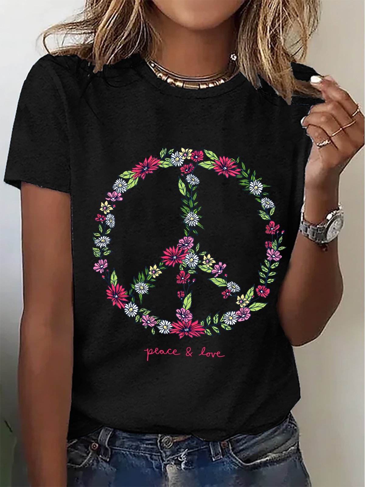 Women's Wildflower Love Peace Sign Casual Short SleeveT-Shirt