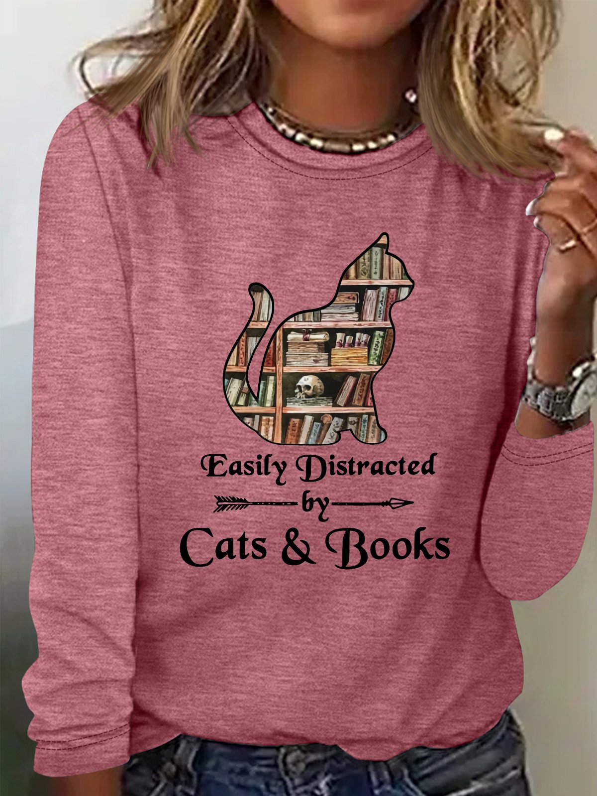 Women's Easily Distracted By Cats And Books Crew Neck Casual Shirt