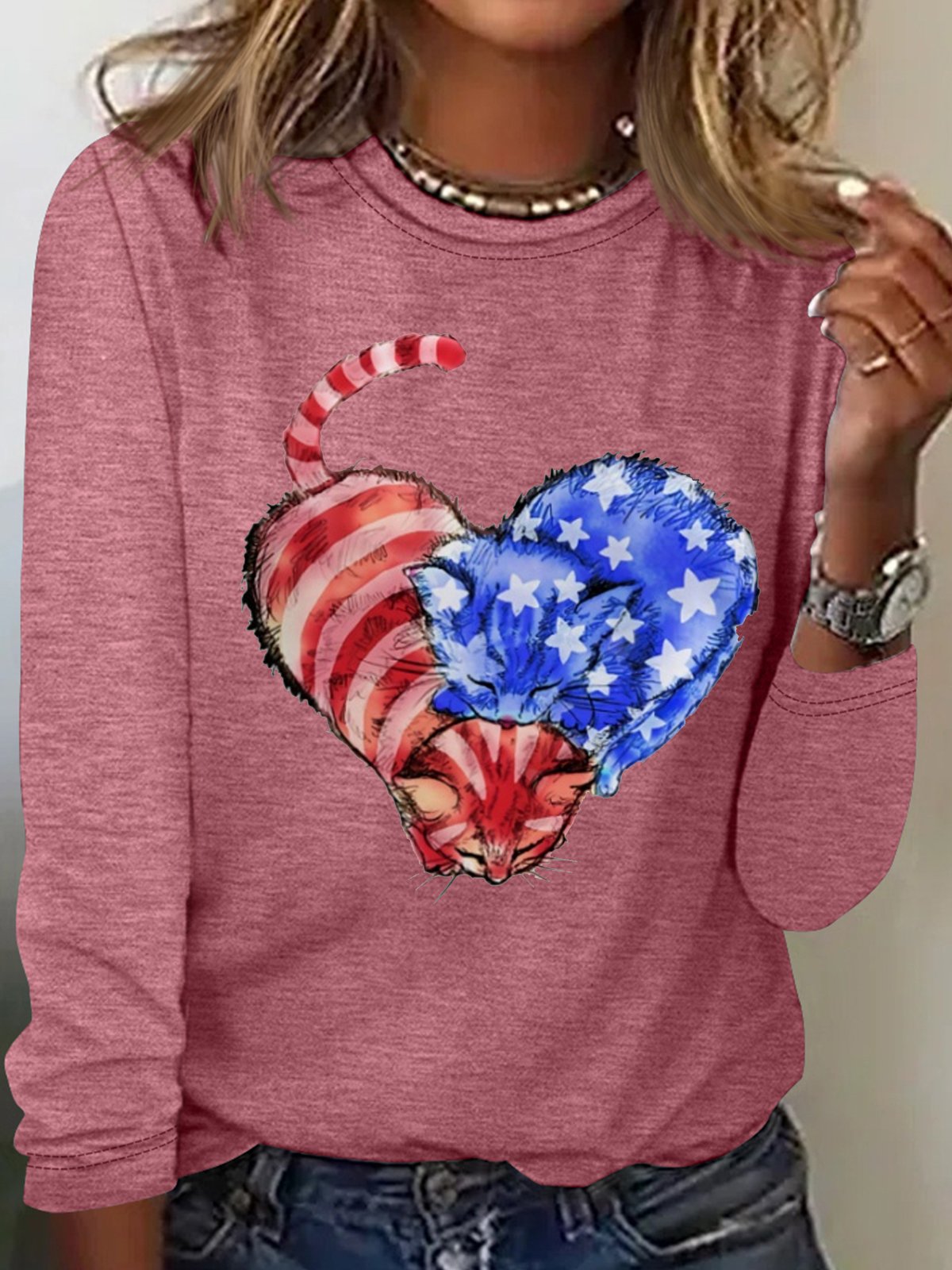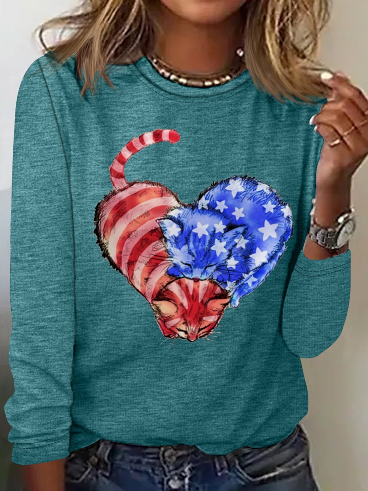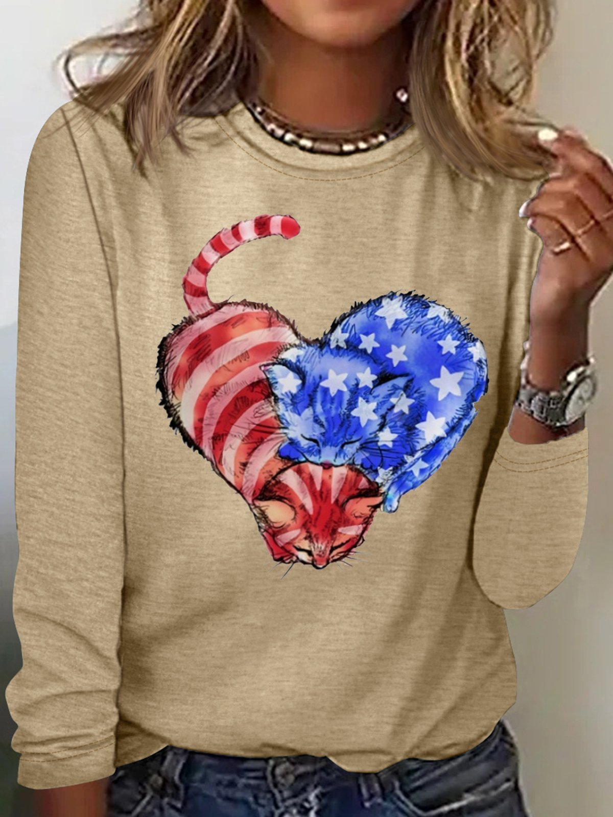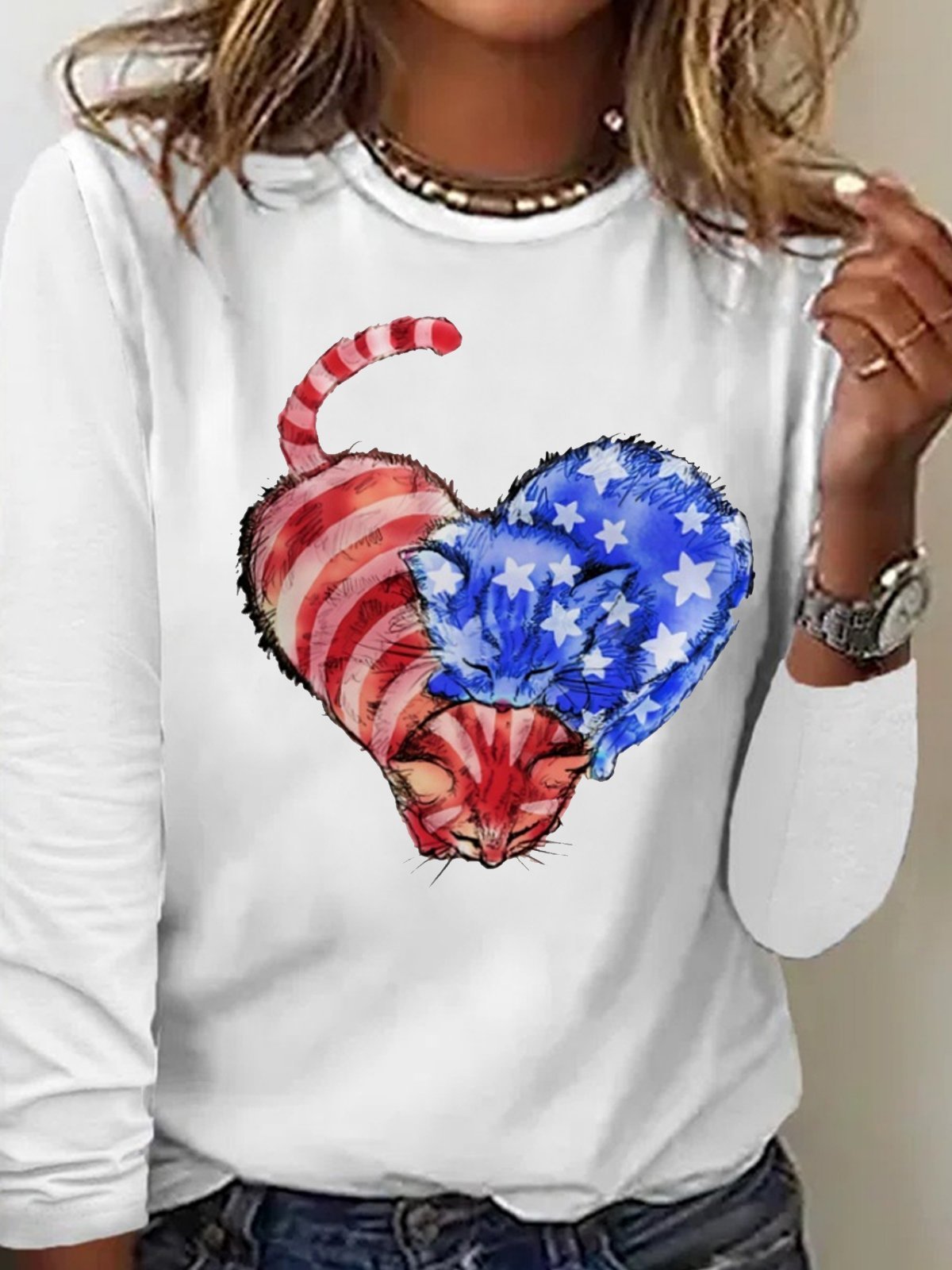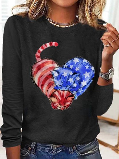 Women's Cat Flag Heart Print Casual Letters Crew Neck Top