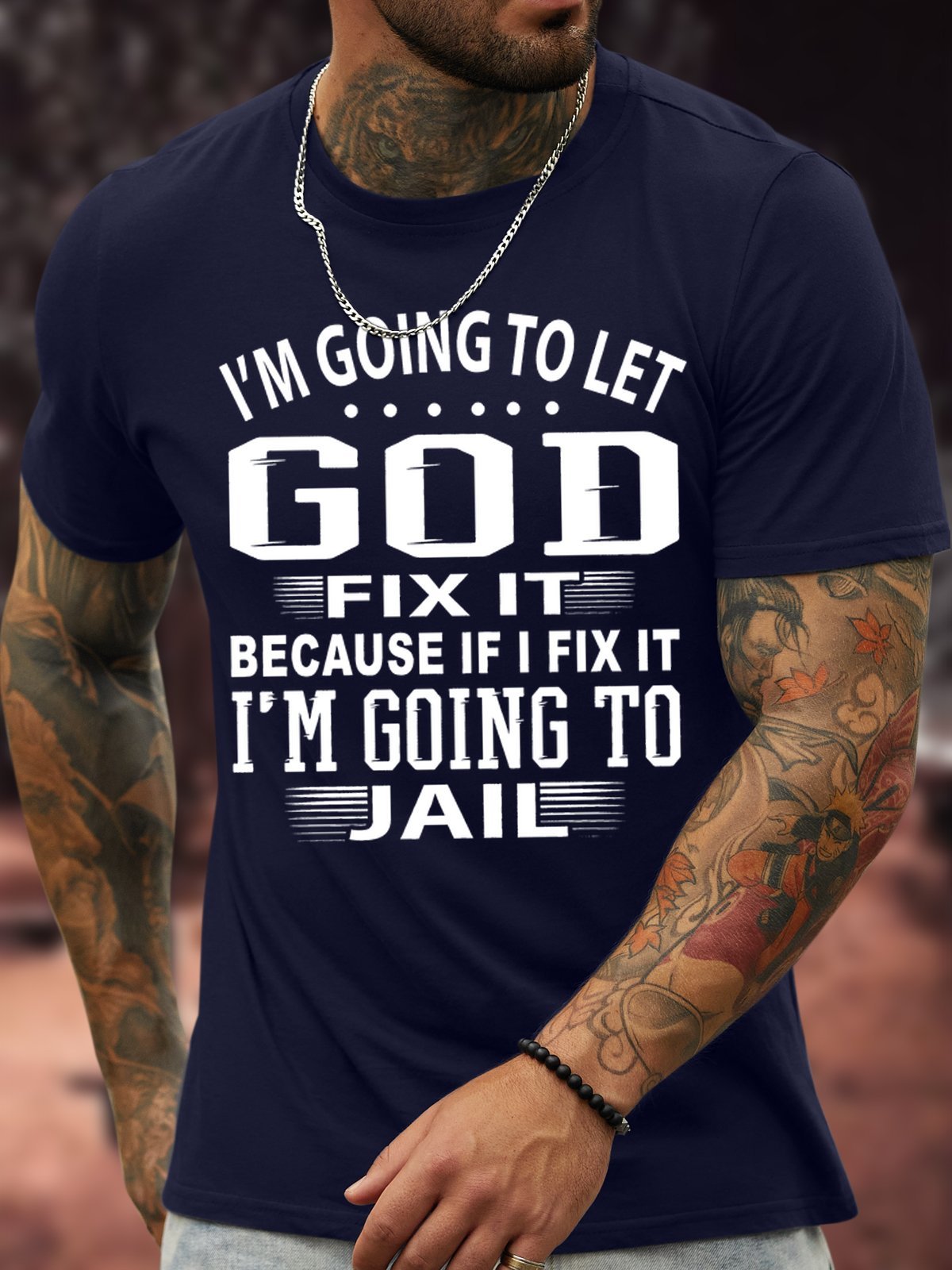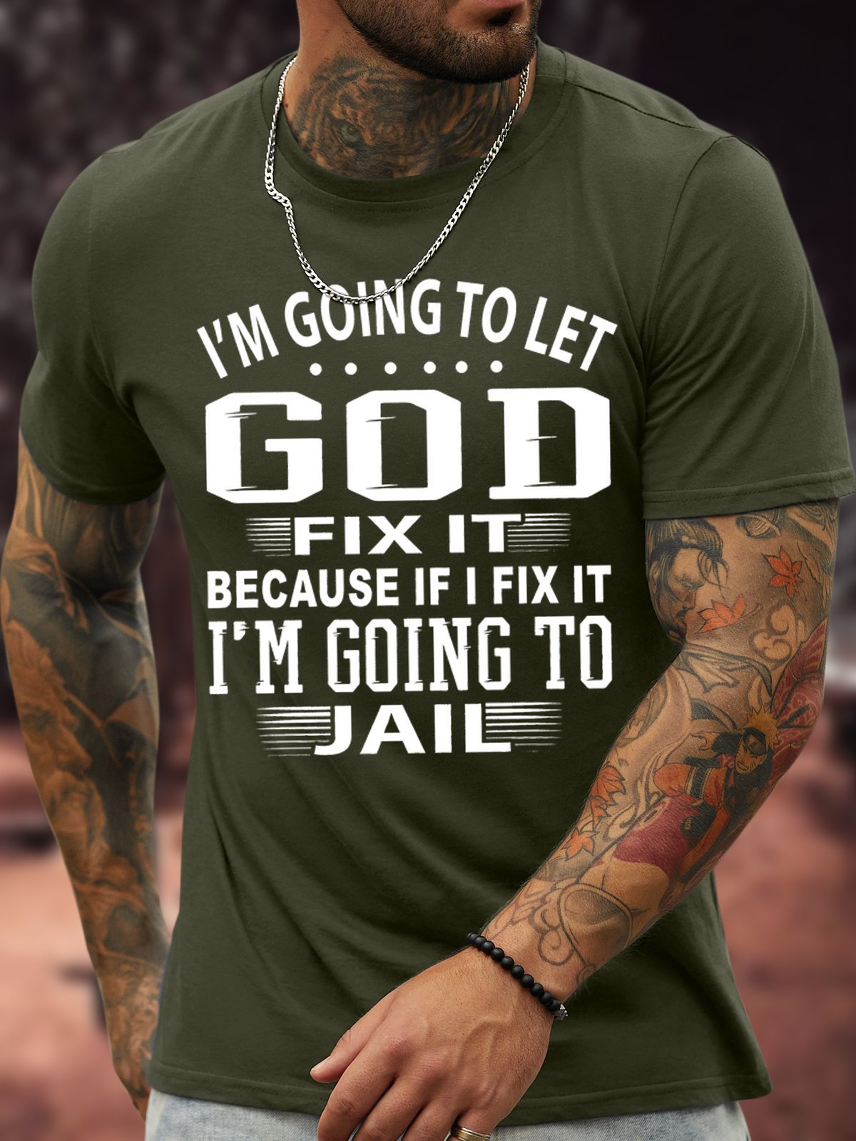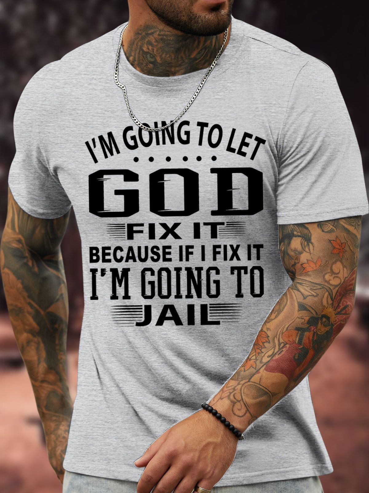 Men's I Am Going To Let God Fix It Because If I Fix It I Am Going To Jail Funny Graphic Print Text Letters Cotton Casual T-Shirt