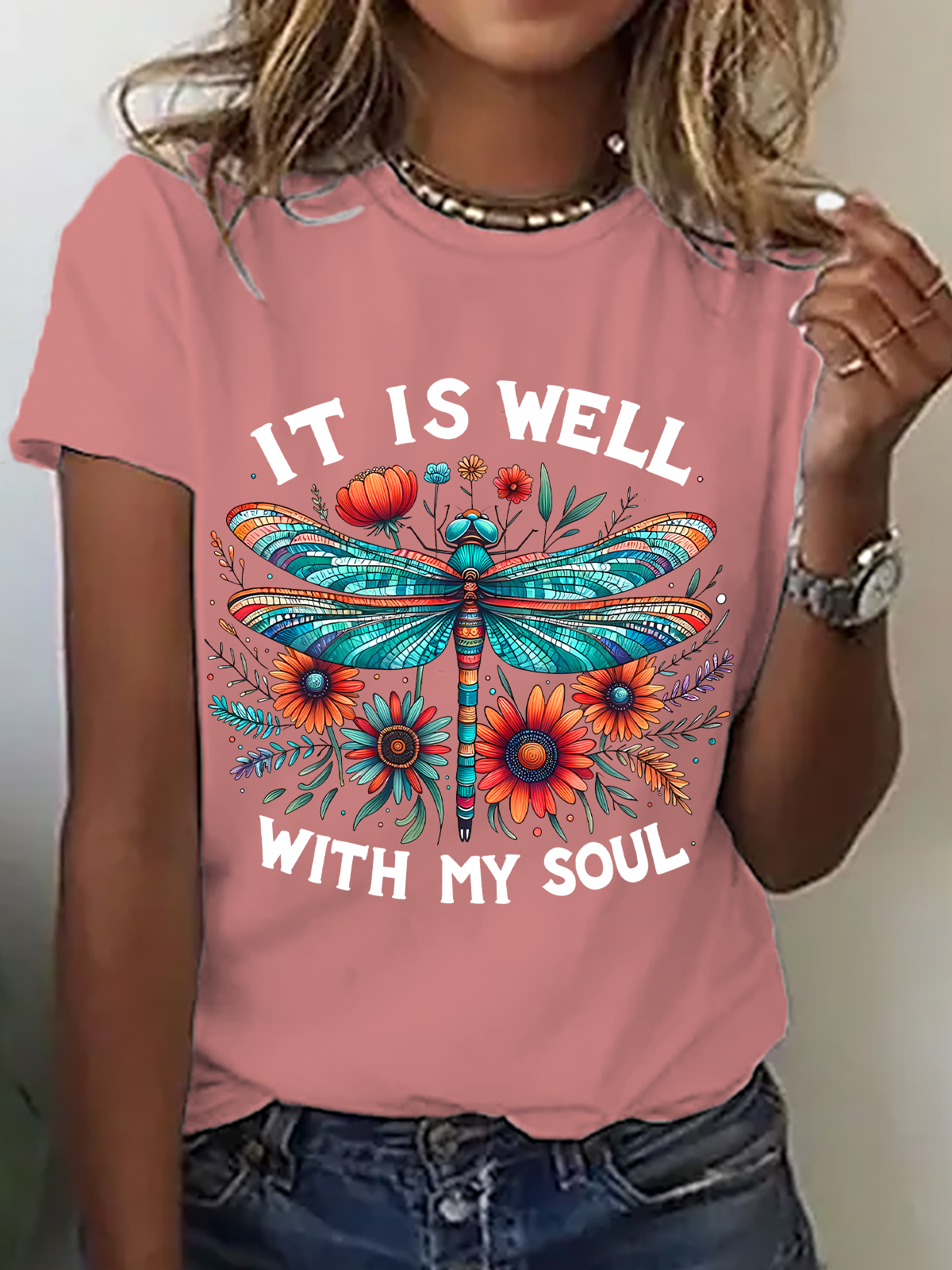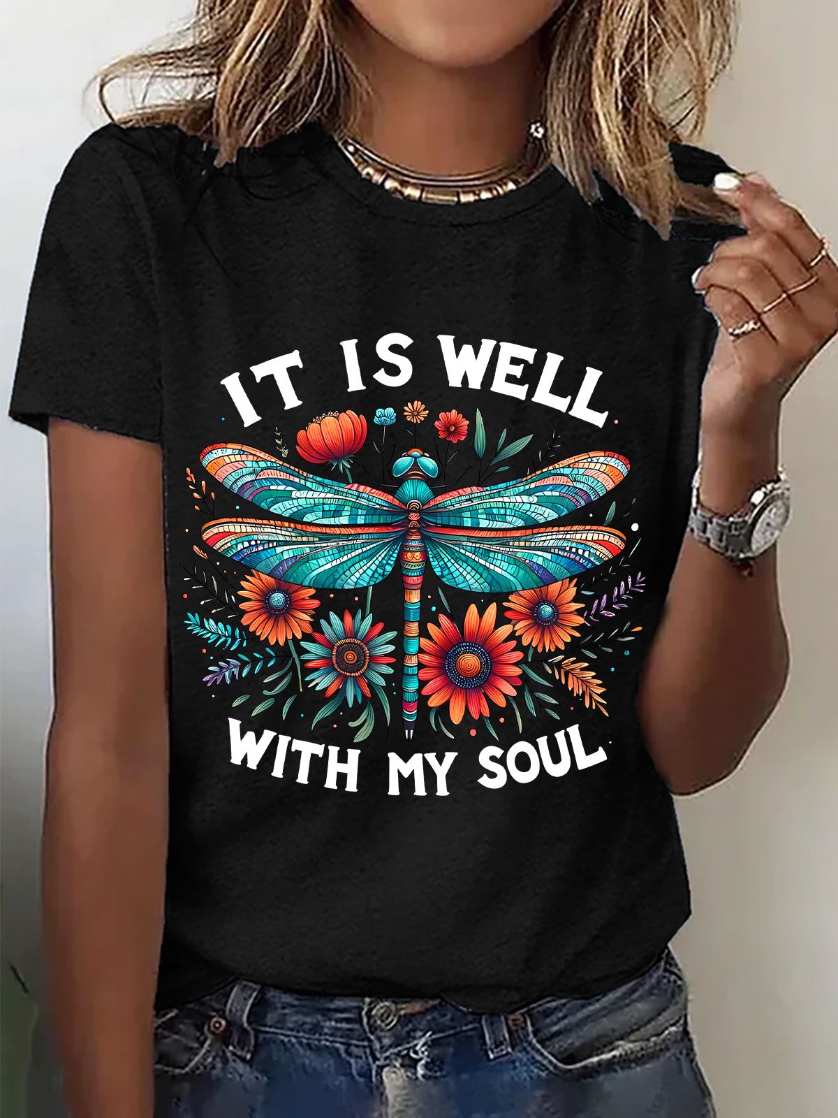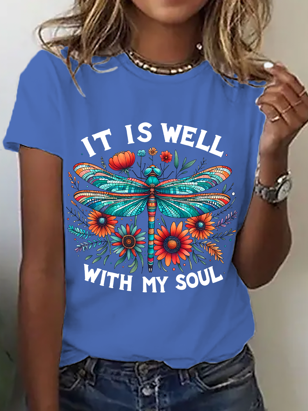 It Is Well Dragonfly Flower Cotton T-Shirt