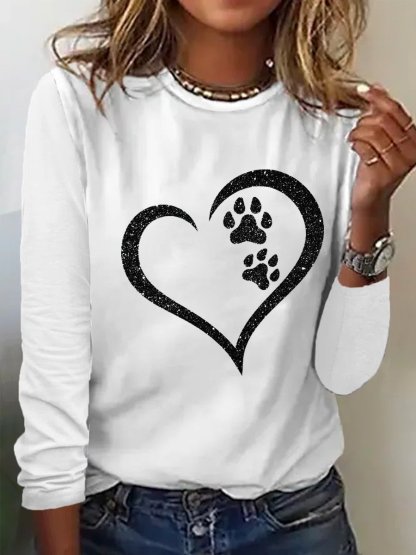 Women's Print Dog Lover Paw Heart Regular Fit Simple Long Sleeve Top