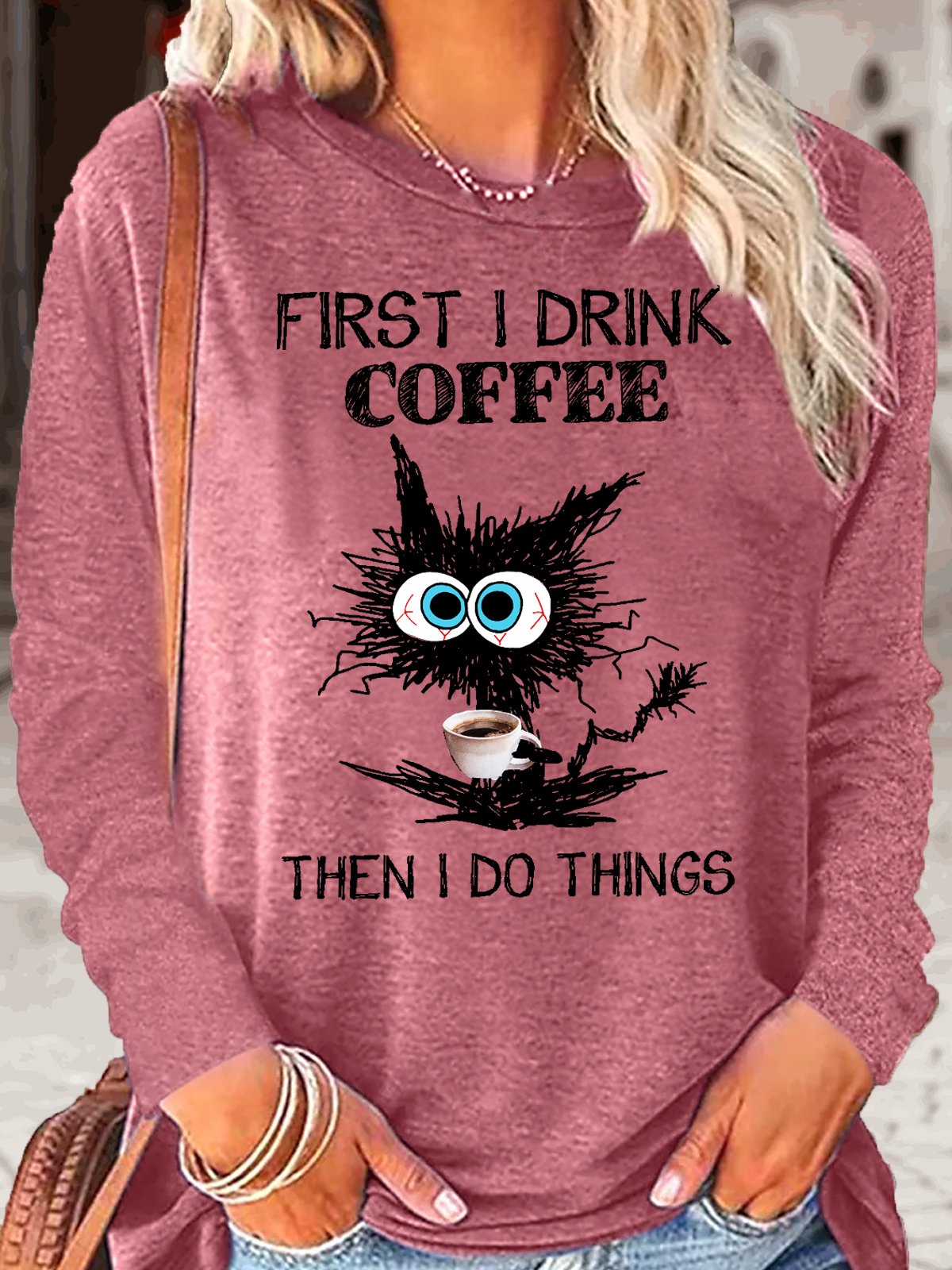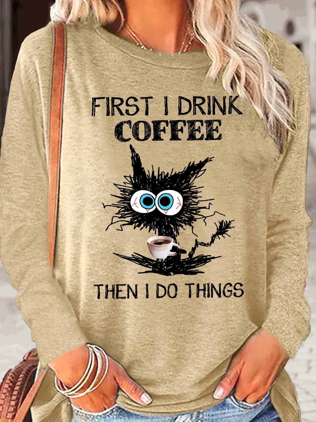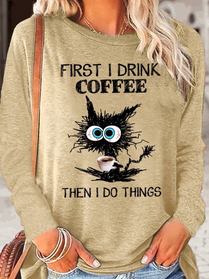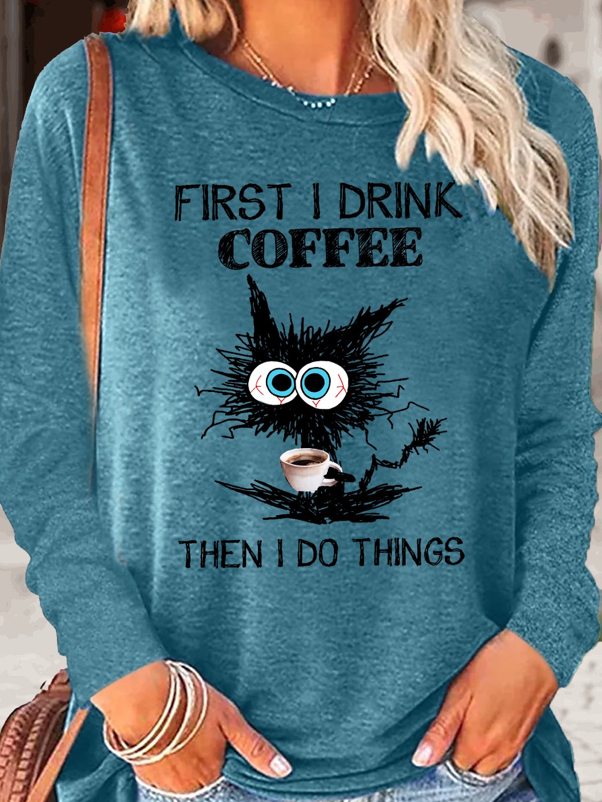 Women's Funny Grumpy Cat Coffee Letter Crew Neck Casual Top