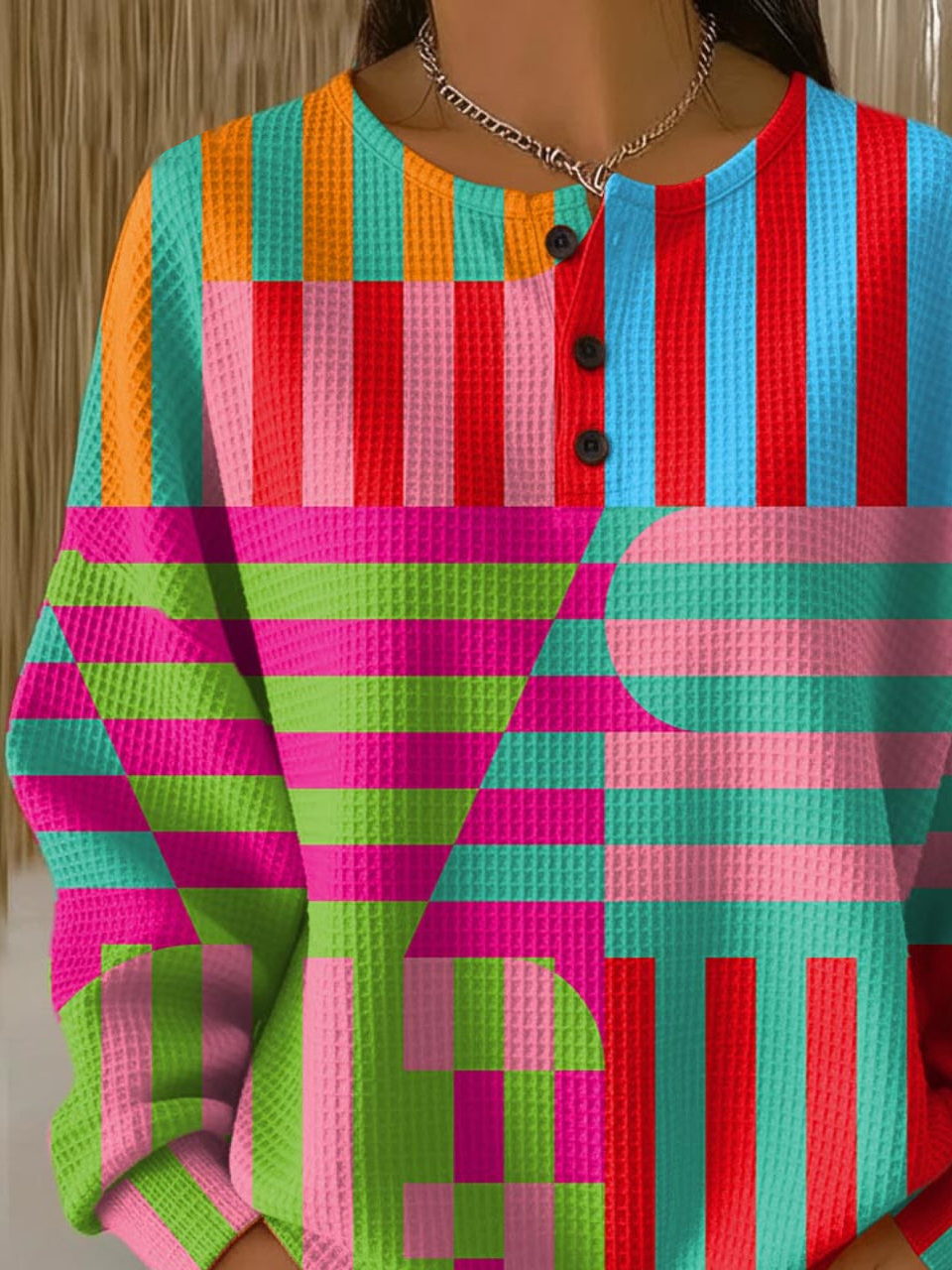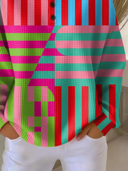 Women's Abstract Print Button-Up Casual Waffle Knit Sweatshirt