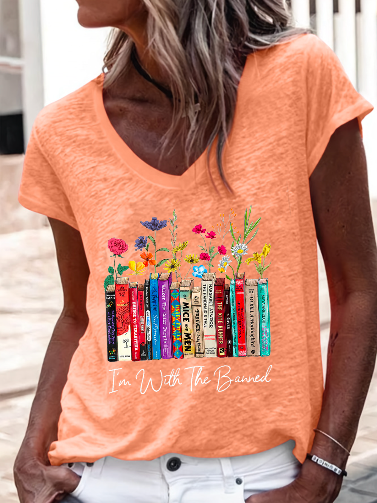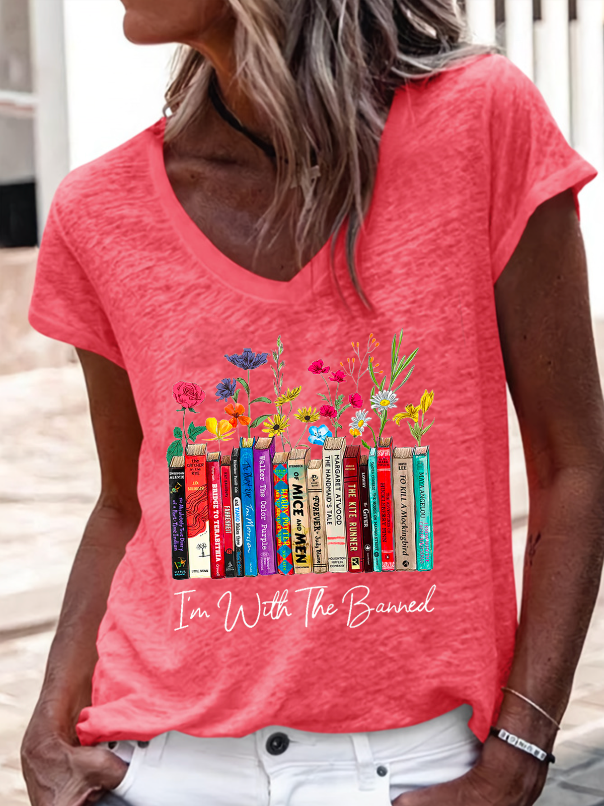 Women's I'm With The Banned Flowers Book Lover Gift Regular Fit V Neck Floral Casual T-Shirt