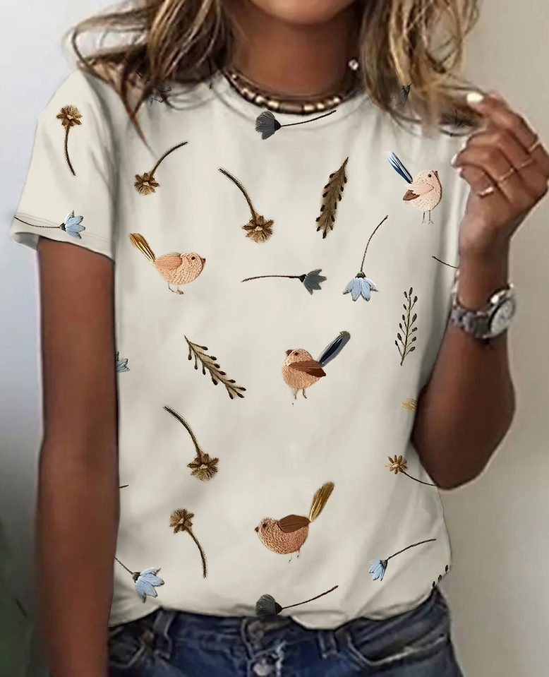 Women's Vintage Bird Floral Print Cotton T-Shirt