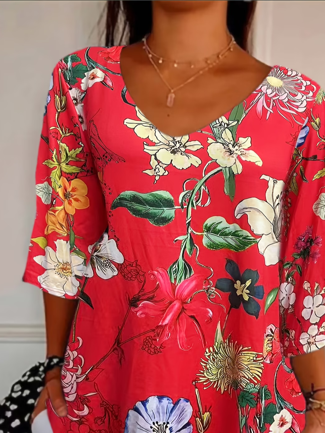 Women's Three Quarter Sleeve T-shirt Spring/Fall Red Floral Printing V Neck Daily Going Out Casual Top